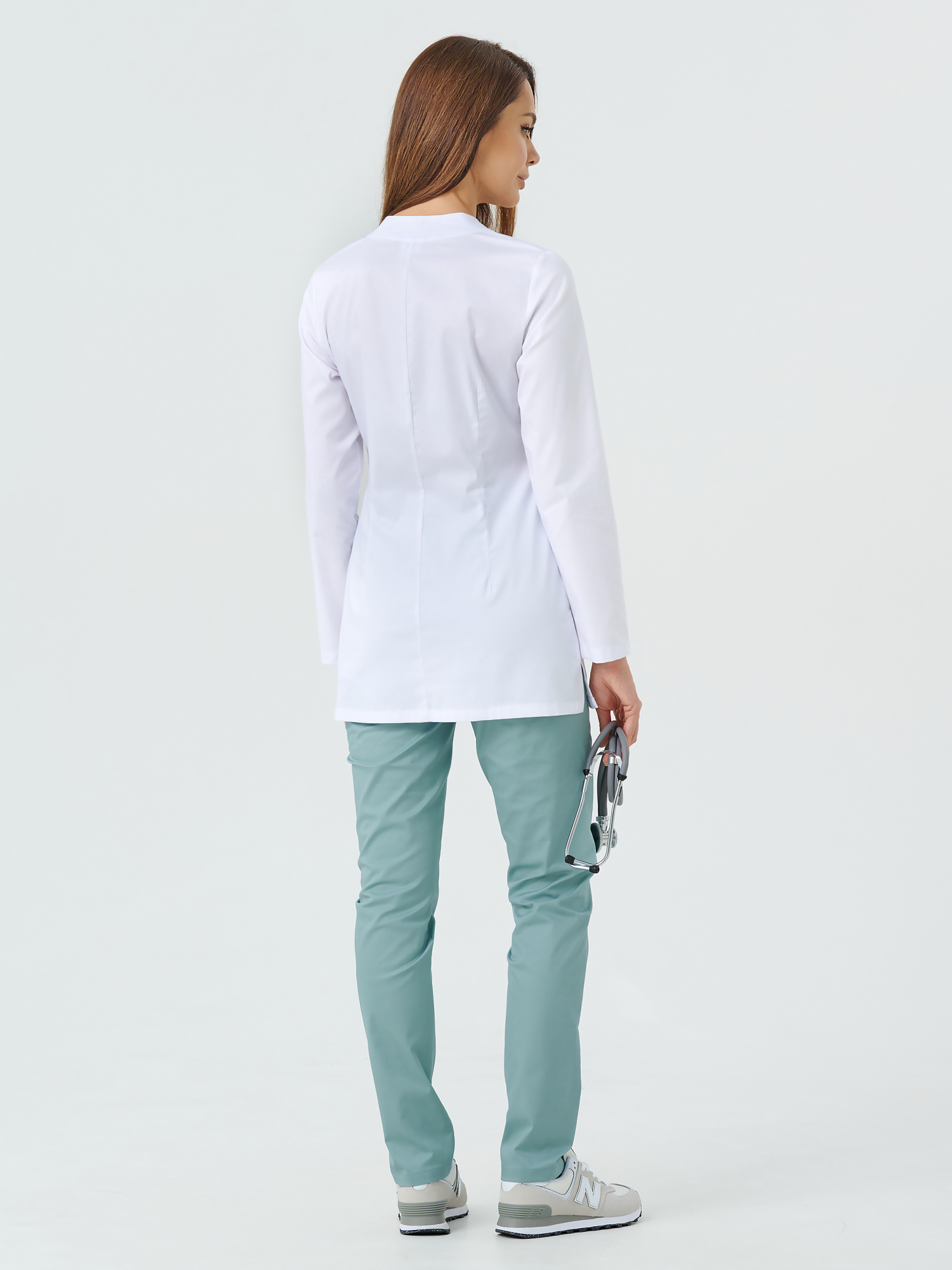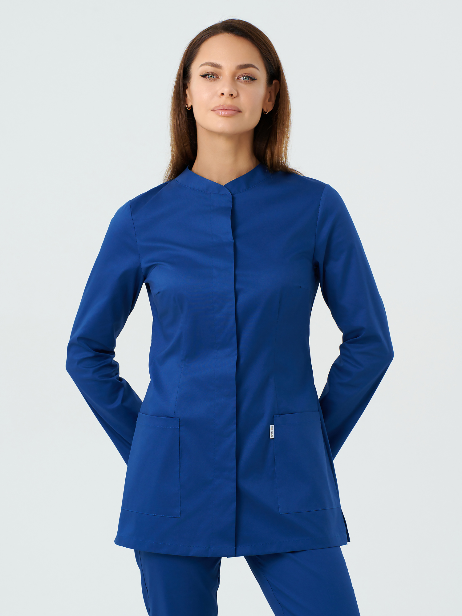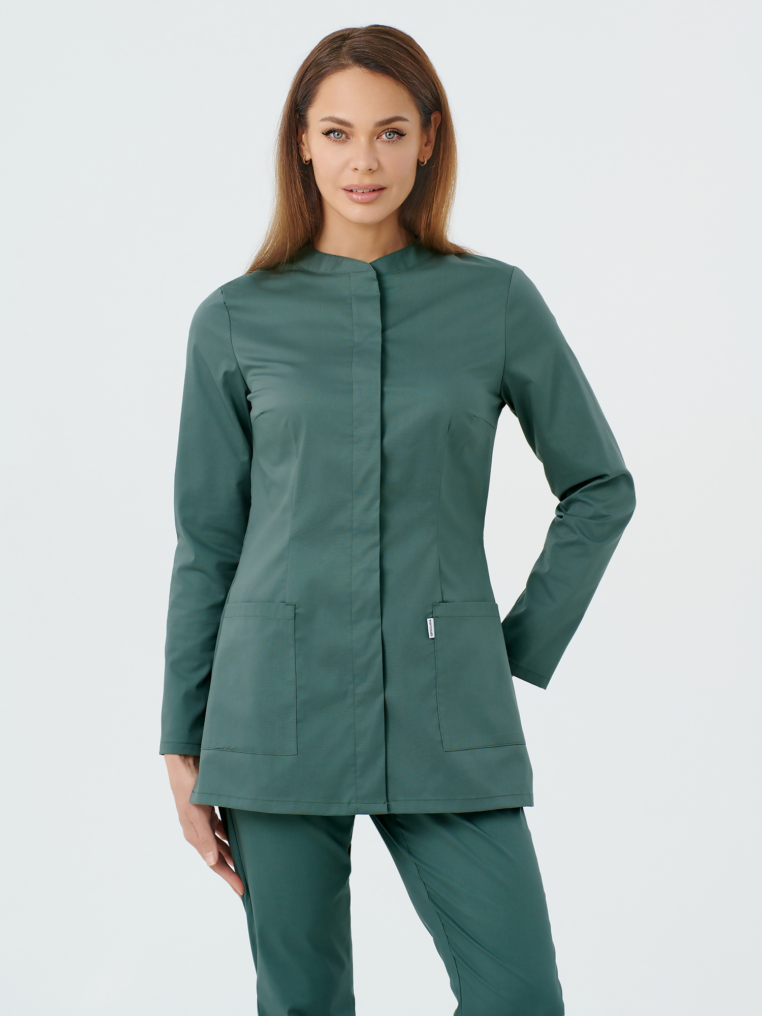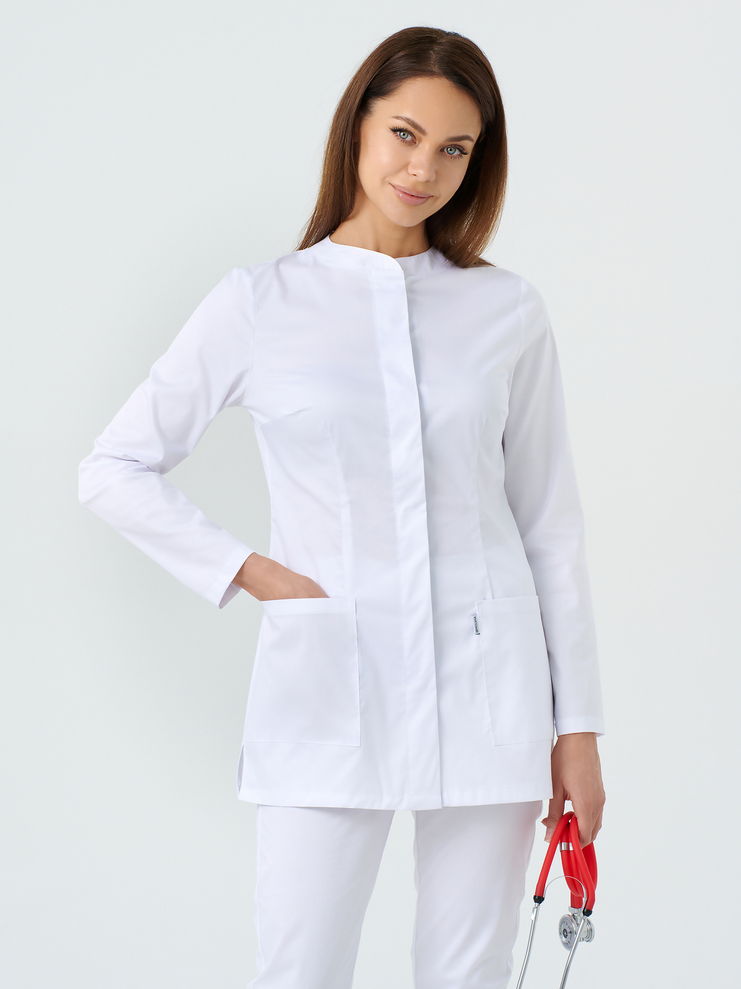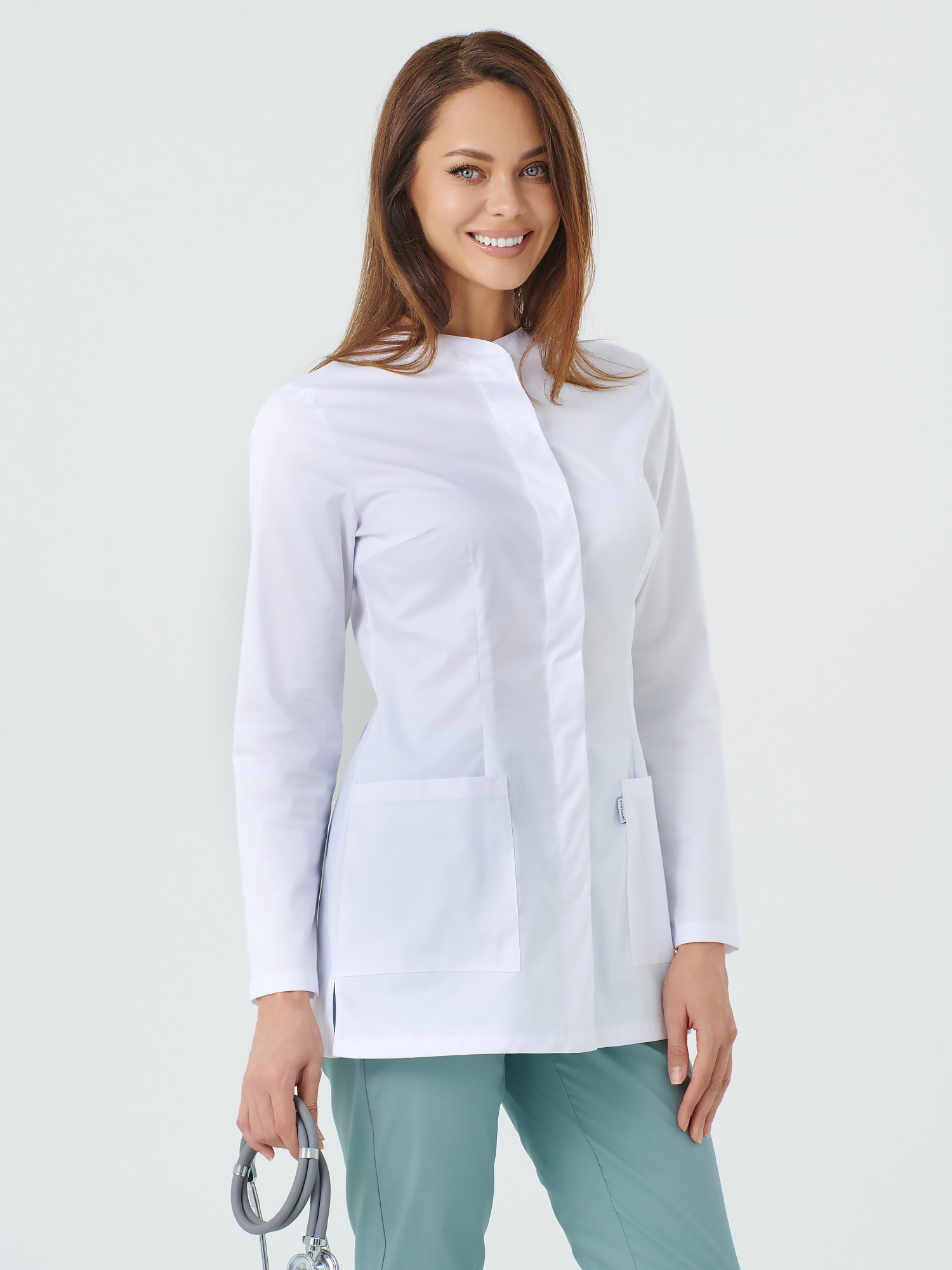 Костюм медицинский женский состоит из блузы и брюк.Блузы полуприлегающего силуэта с супатной застежкой на 8 кнопок, с боковыми разрезами.