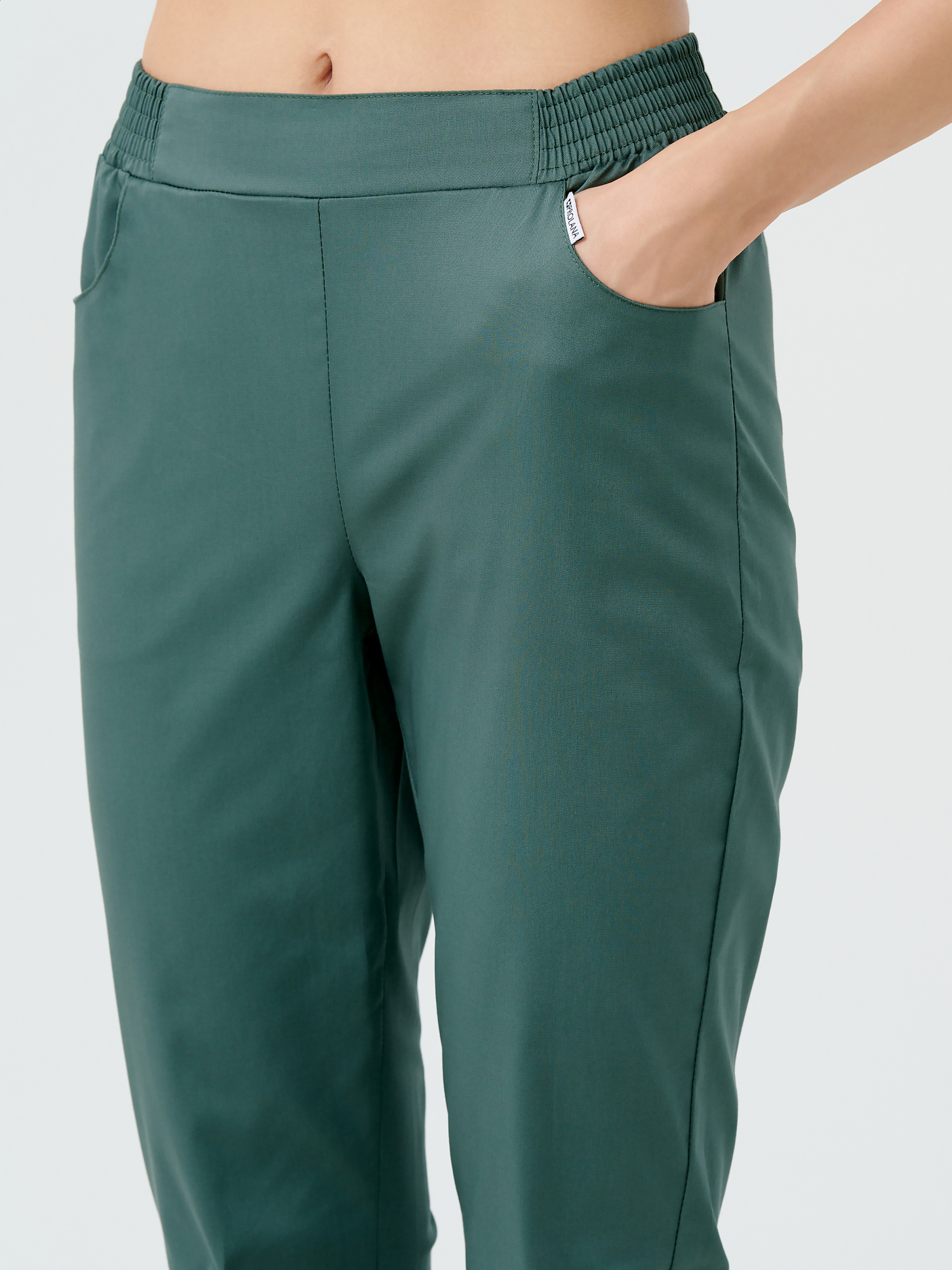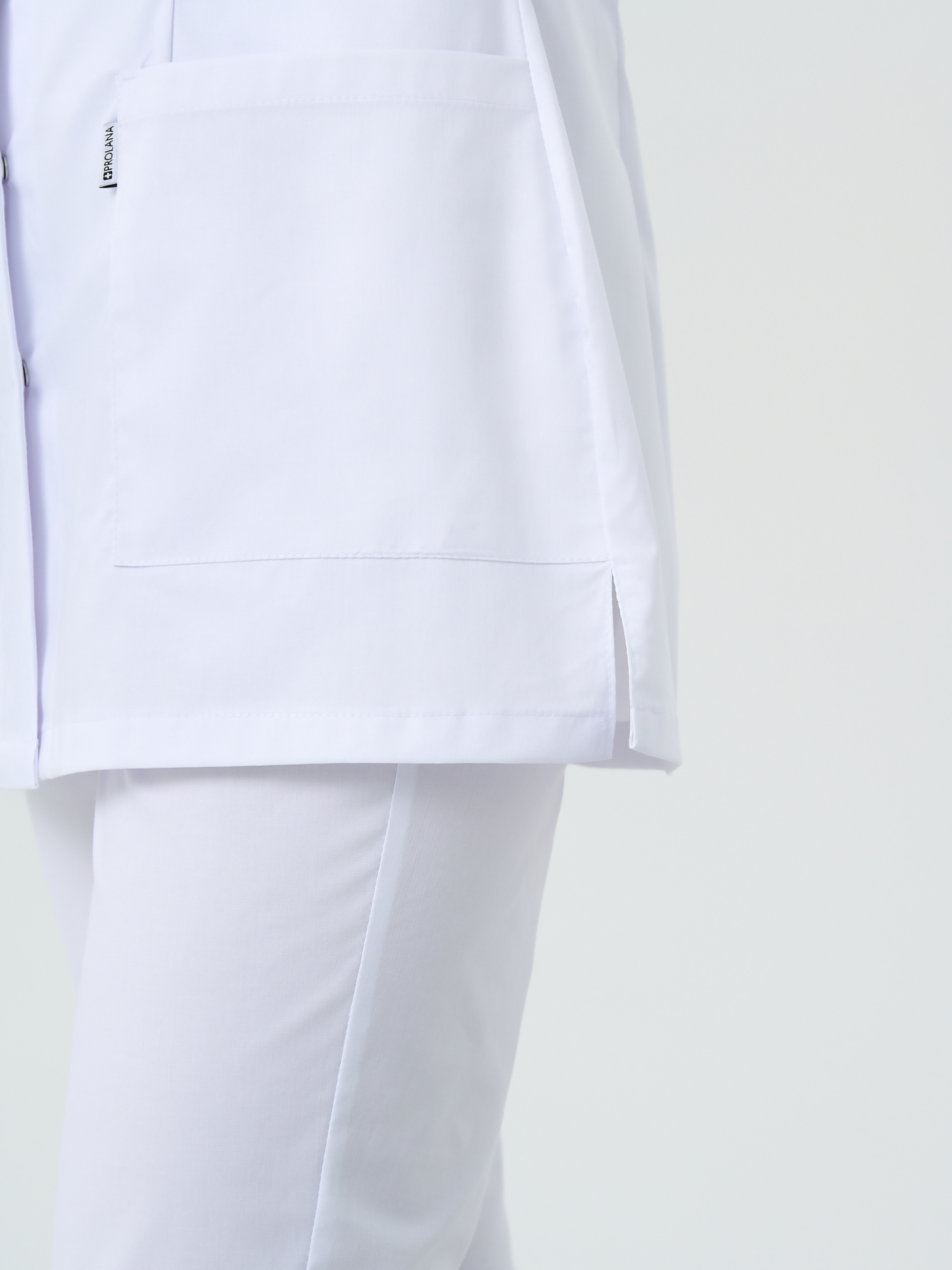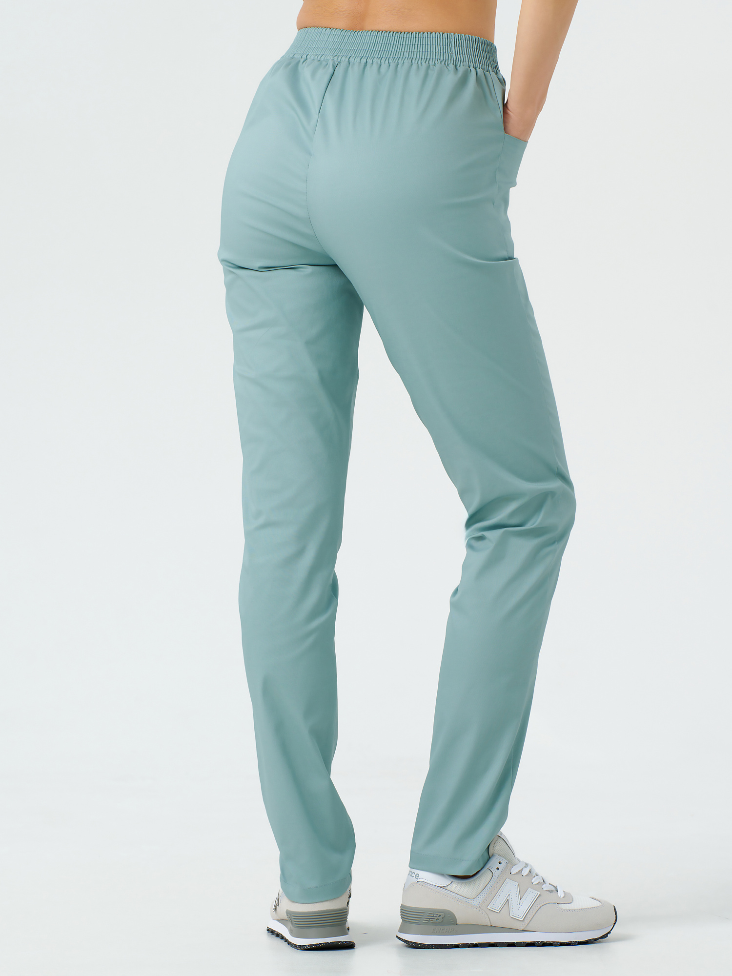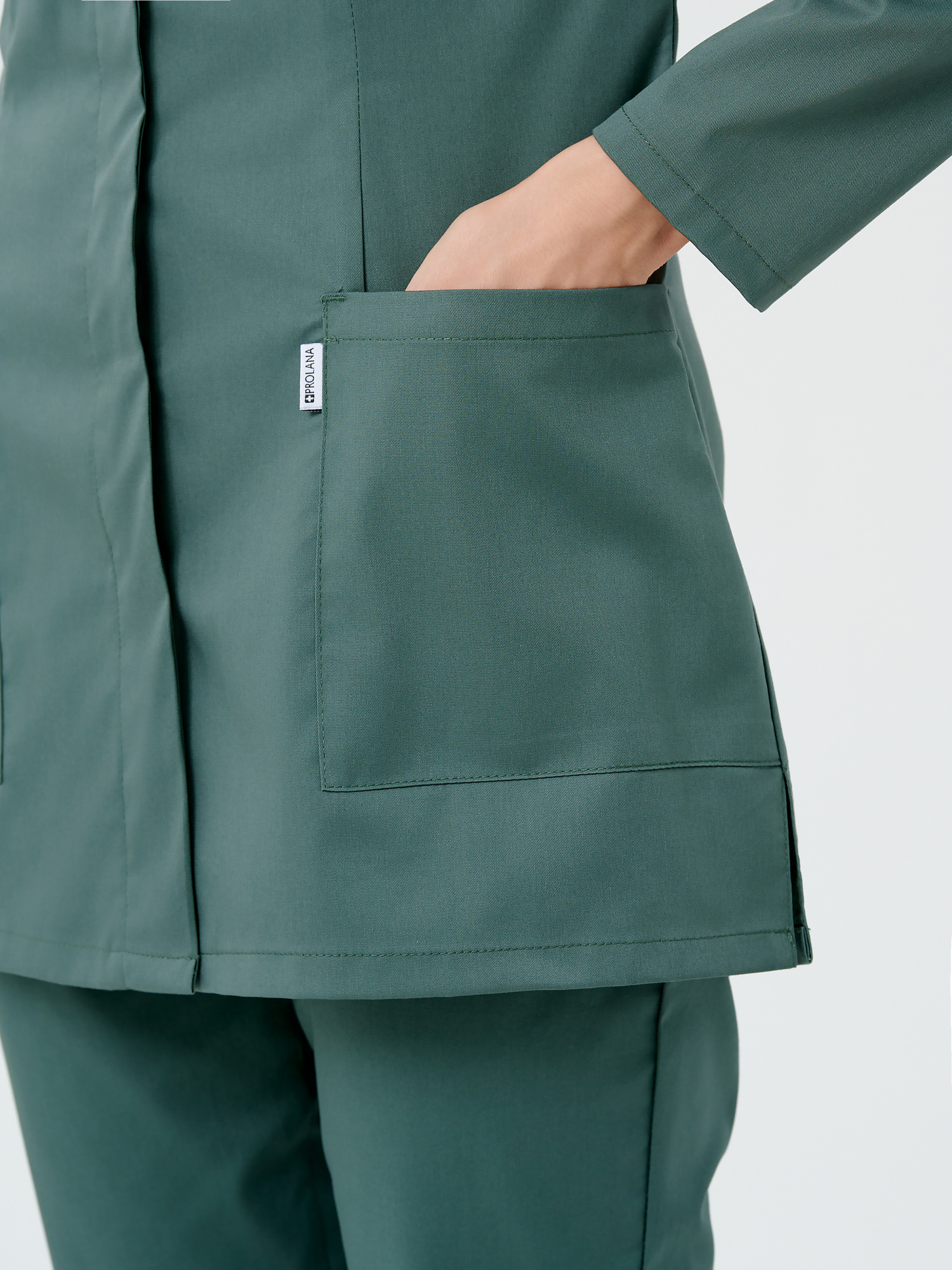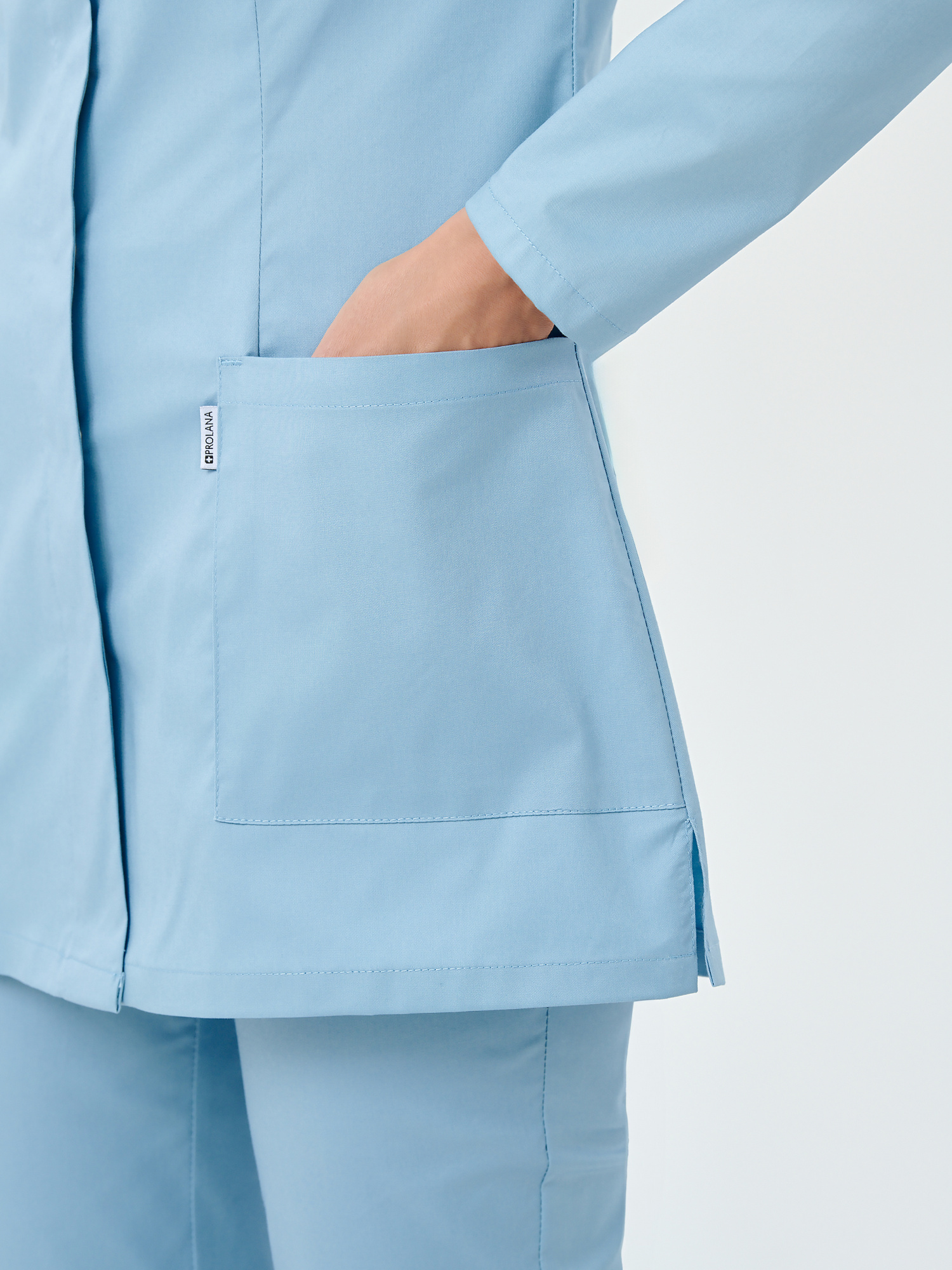 Костюм медицинский женский состоит из блузы и брюк.Блузы полуприлегающего силуэта с супатной застежкой на 8 кнопок, с боковыми разрезами.