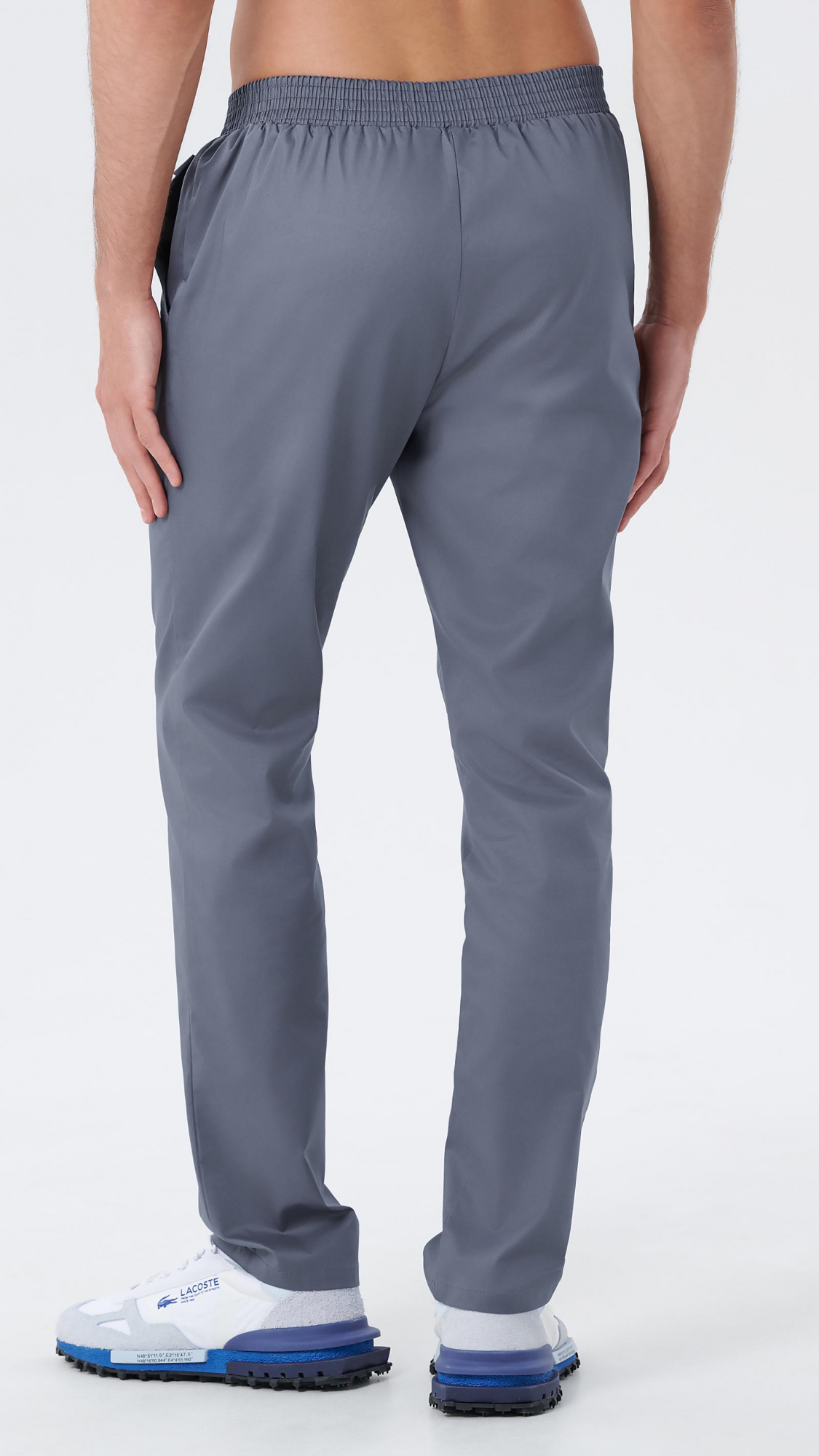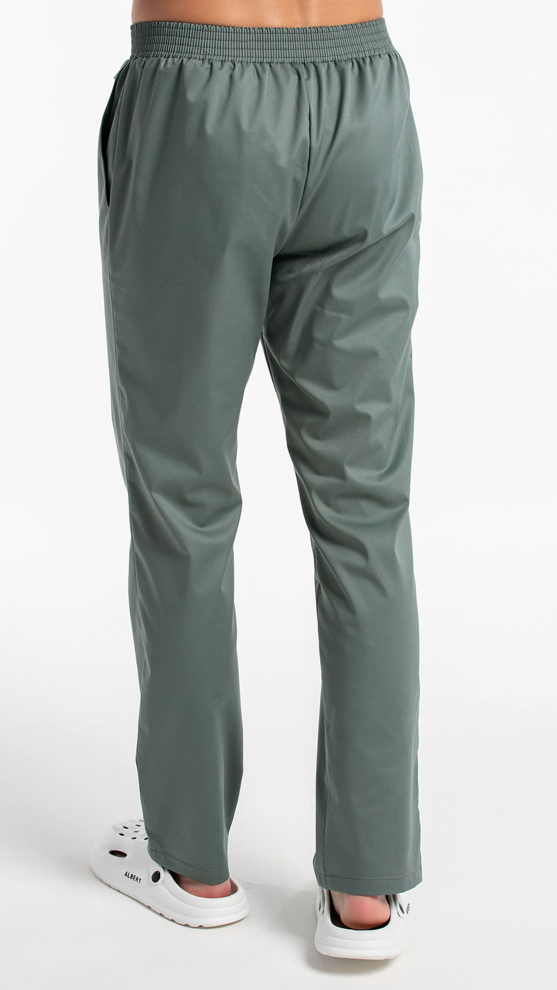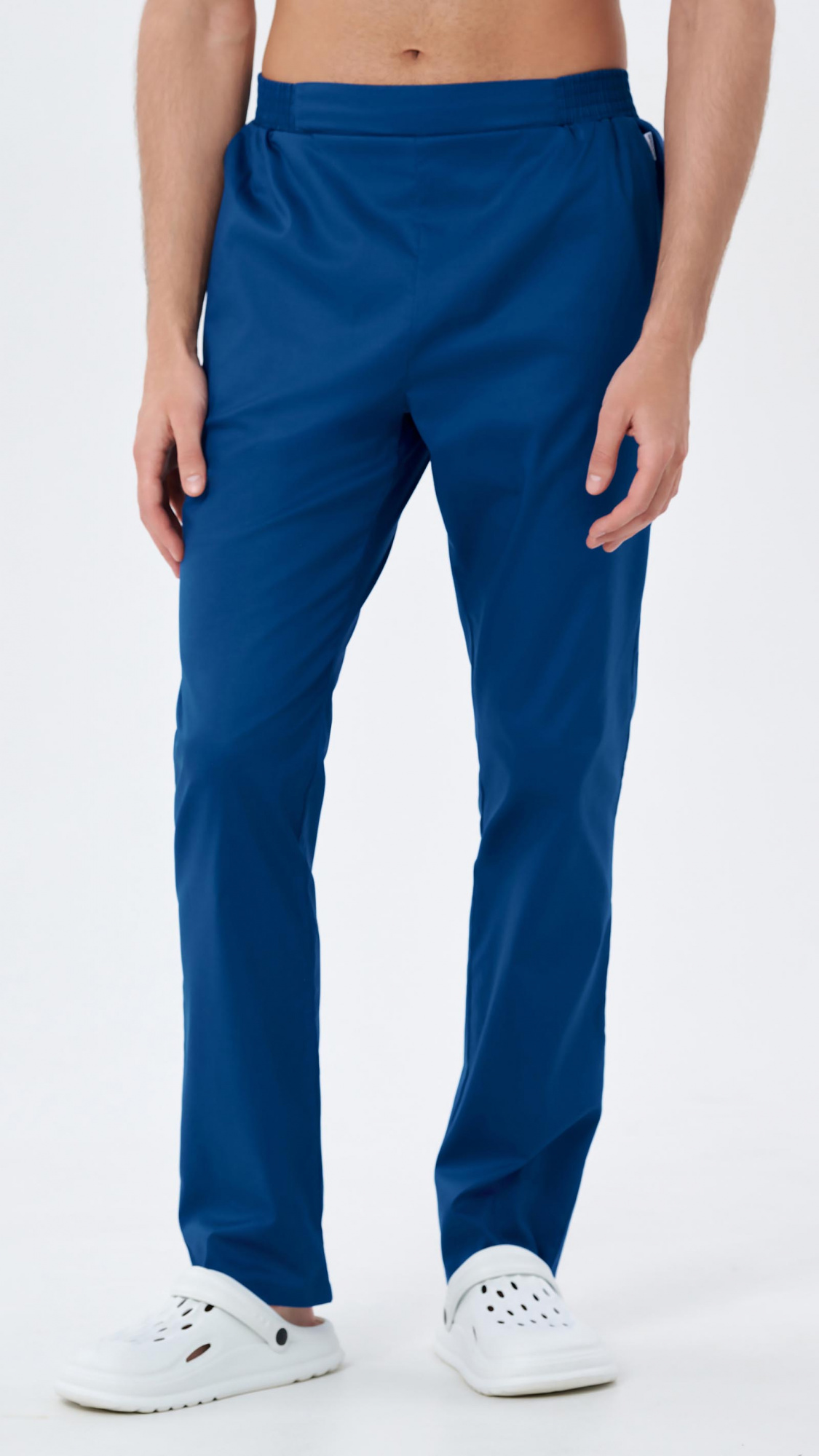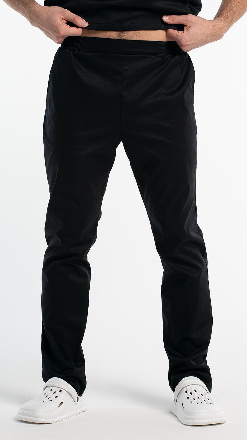 Брюки прямые, заужены к низу, с притачным поясом. Пояс состоит из двух частей. Центральная часть пояса передних половинок брюк без эластичной тесьмы. Вторая часть стянута эластичной тесьмой. Передние половинки брюк с боковыми карманами с наклонным входом, с отрезными бочками. Низ брюк обработан швом вподгибку с закрытым срезом.