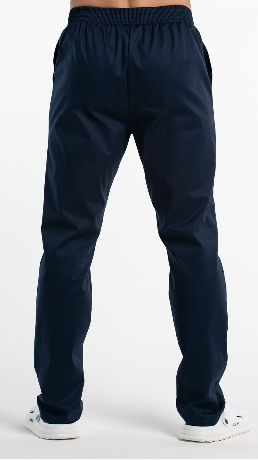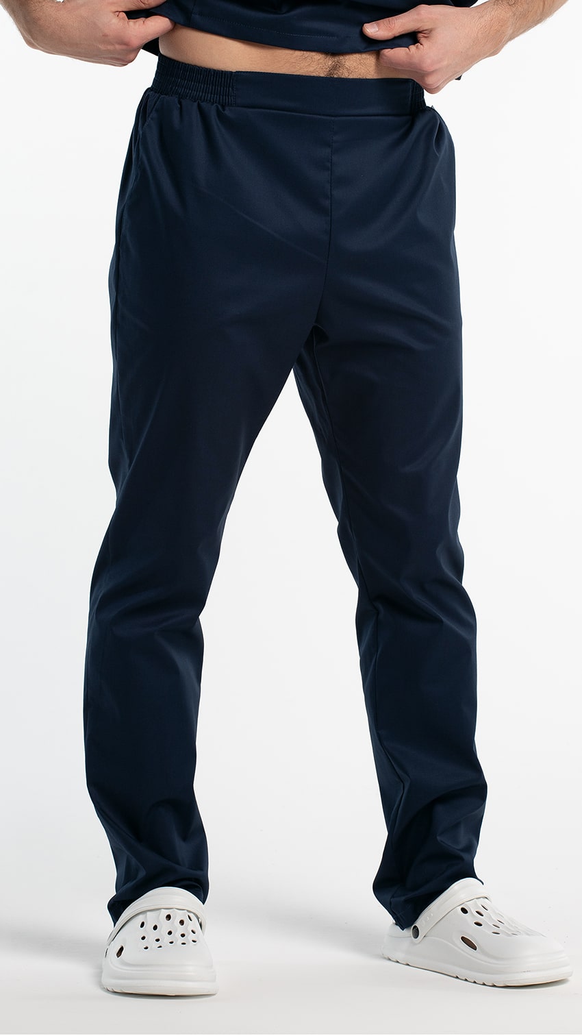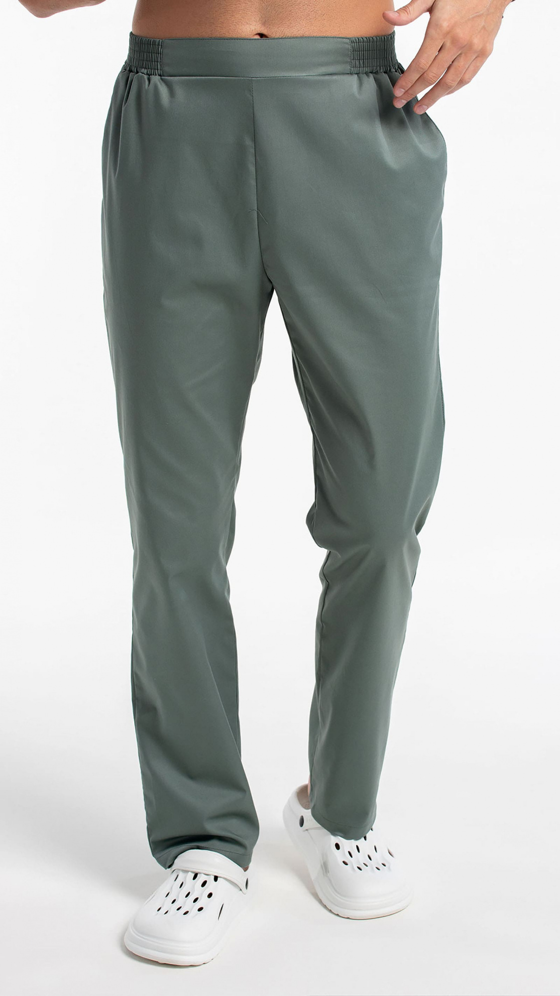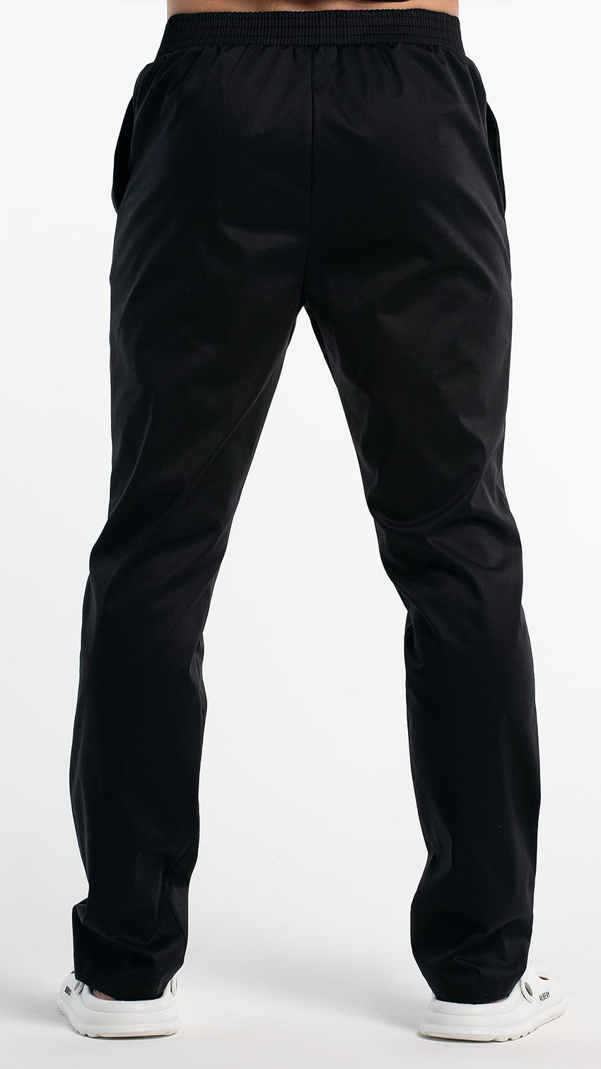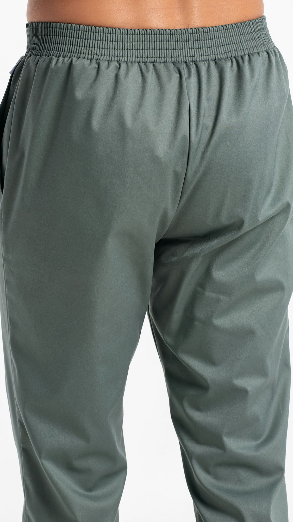 Брюки прямые, заужены к низу, с притачным поясом. Пояс состоит из двух частей. Центральная часть пояса передних половинок брюк без эластичной тесьмы. Вторая часть стянута эластичной тесьмой. Передние половинки брюк с боковыми карманами с наклонным входом, с отрезными бочками. Низ брюк обработан швом вподгибку с закрытым срезом.