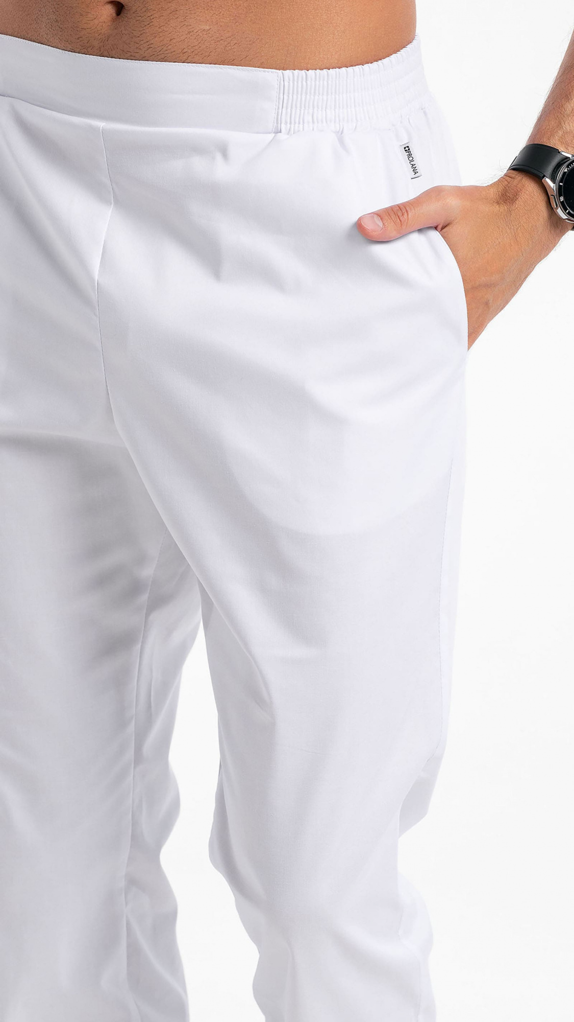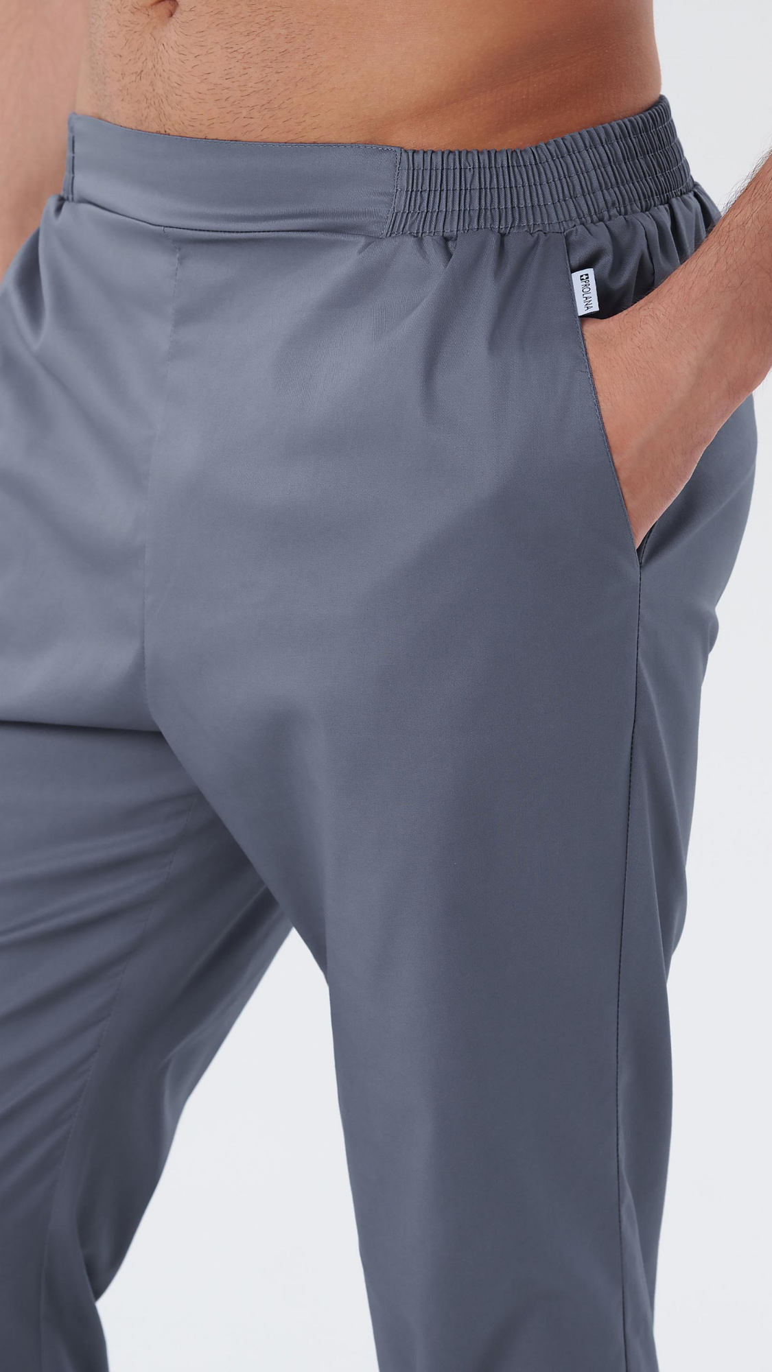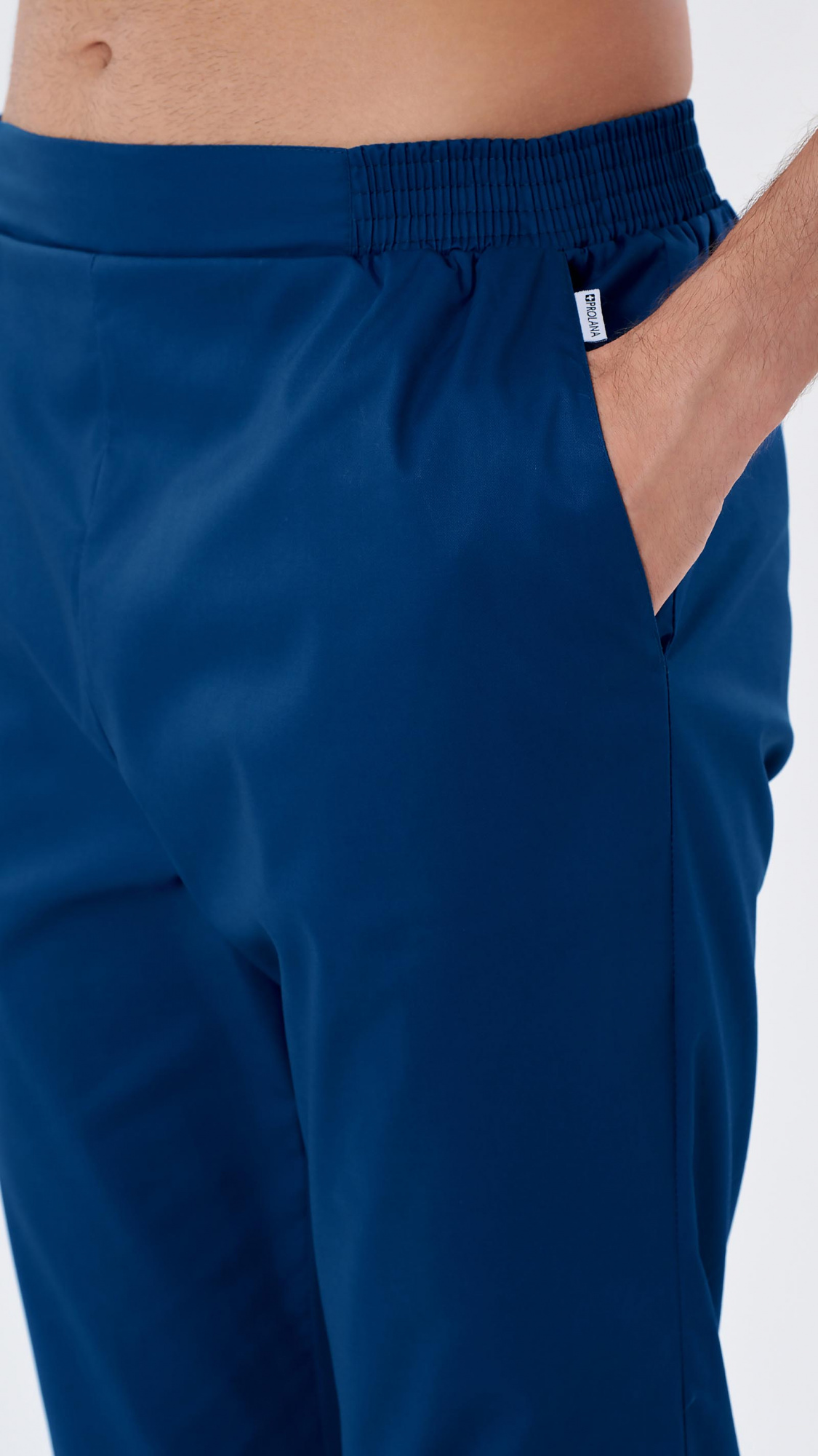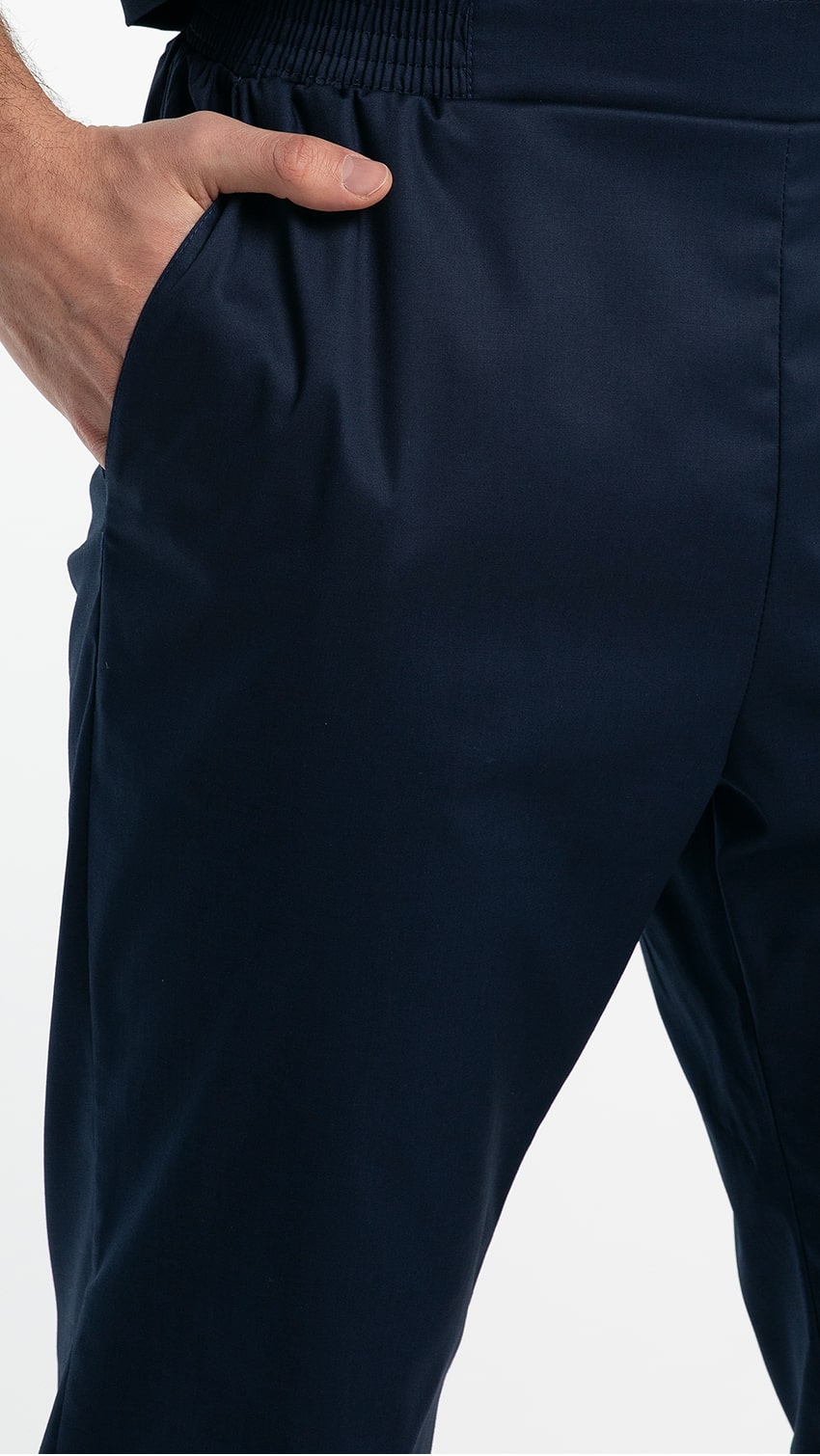 Брюки прямые, заужены к низу, с притачным поясом. Пояс состоит из двух частей. Центральная часть пояса передних половинок брюк без эластичной тесьмы. Вторая часть стянута эластичной тесьмой. Передние половинки брюк с боковыми карманами с наклонным входом, с отрезными бочками. Низ брюк обработан швом вподгибку с закрытым срезом.