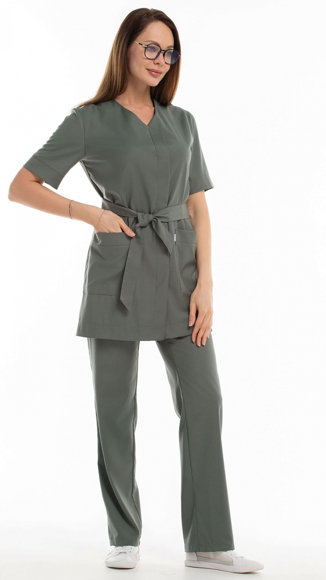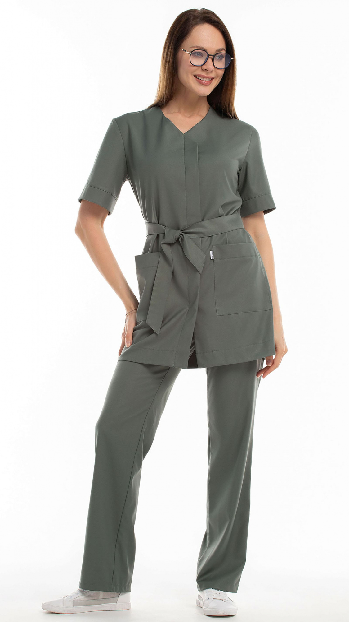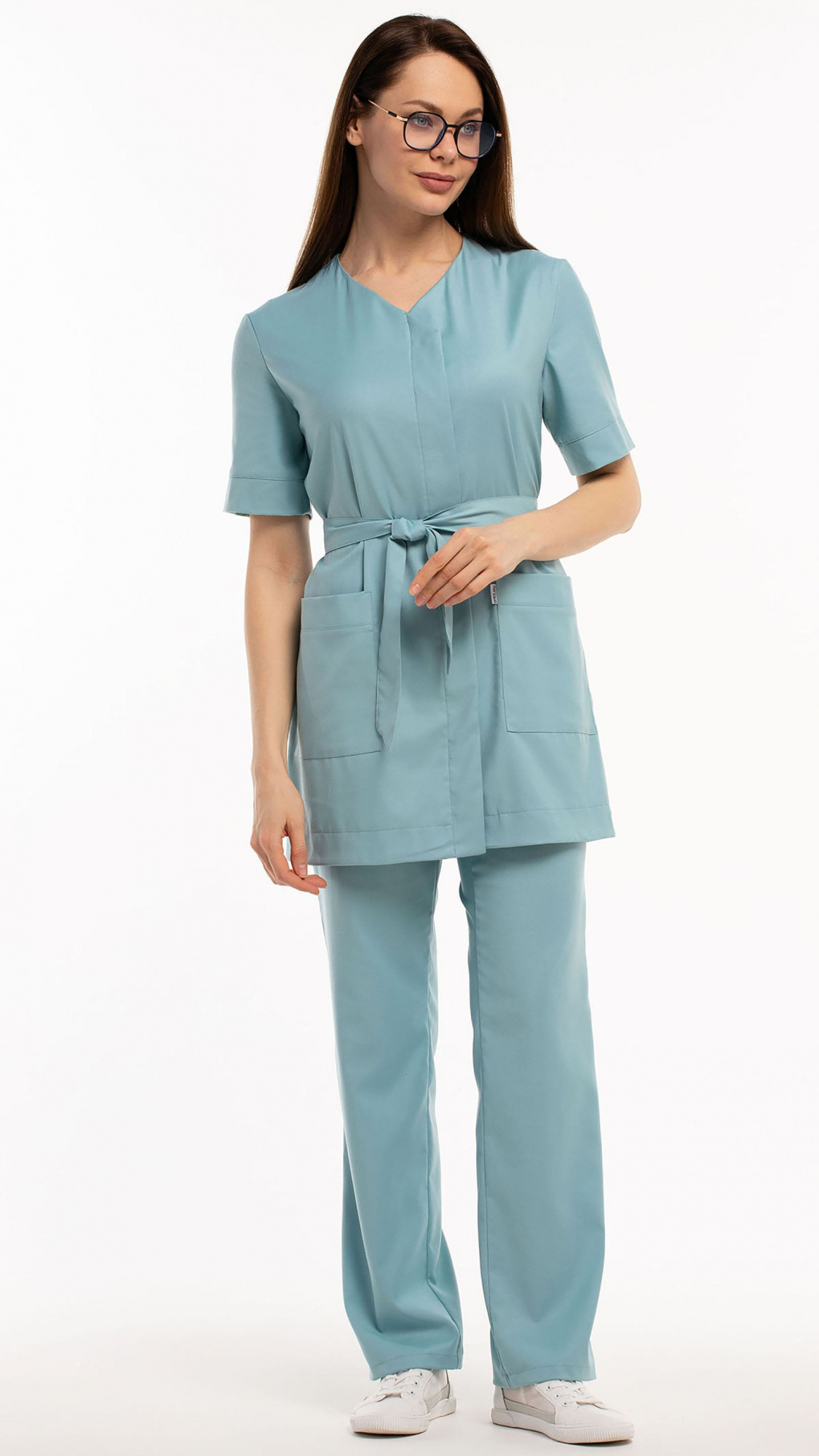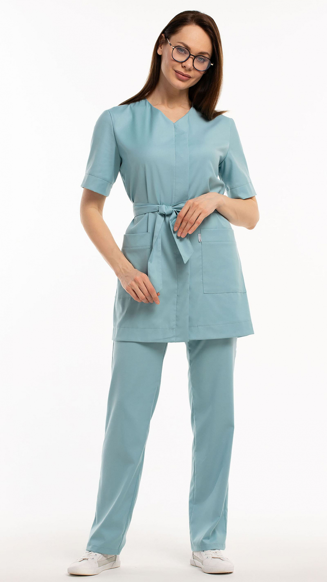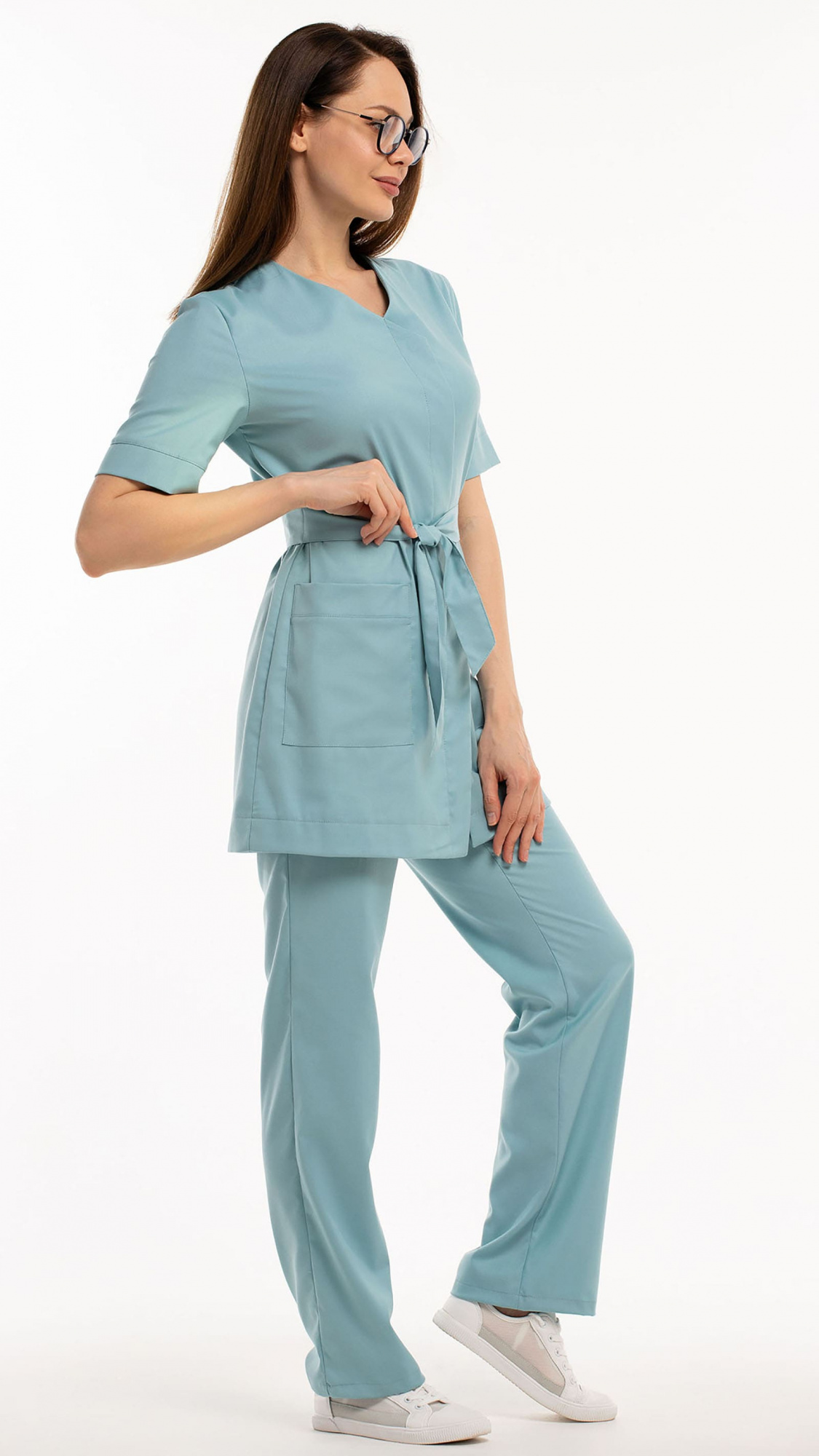 Костюм медицинский женский состоит из удлиненной блузы и брюк.Блуза прямого силуэта со смещенной супатной застежкой на 7 кнопок, с V-образным вырезом горловины, с поясом.