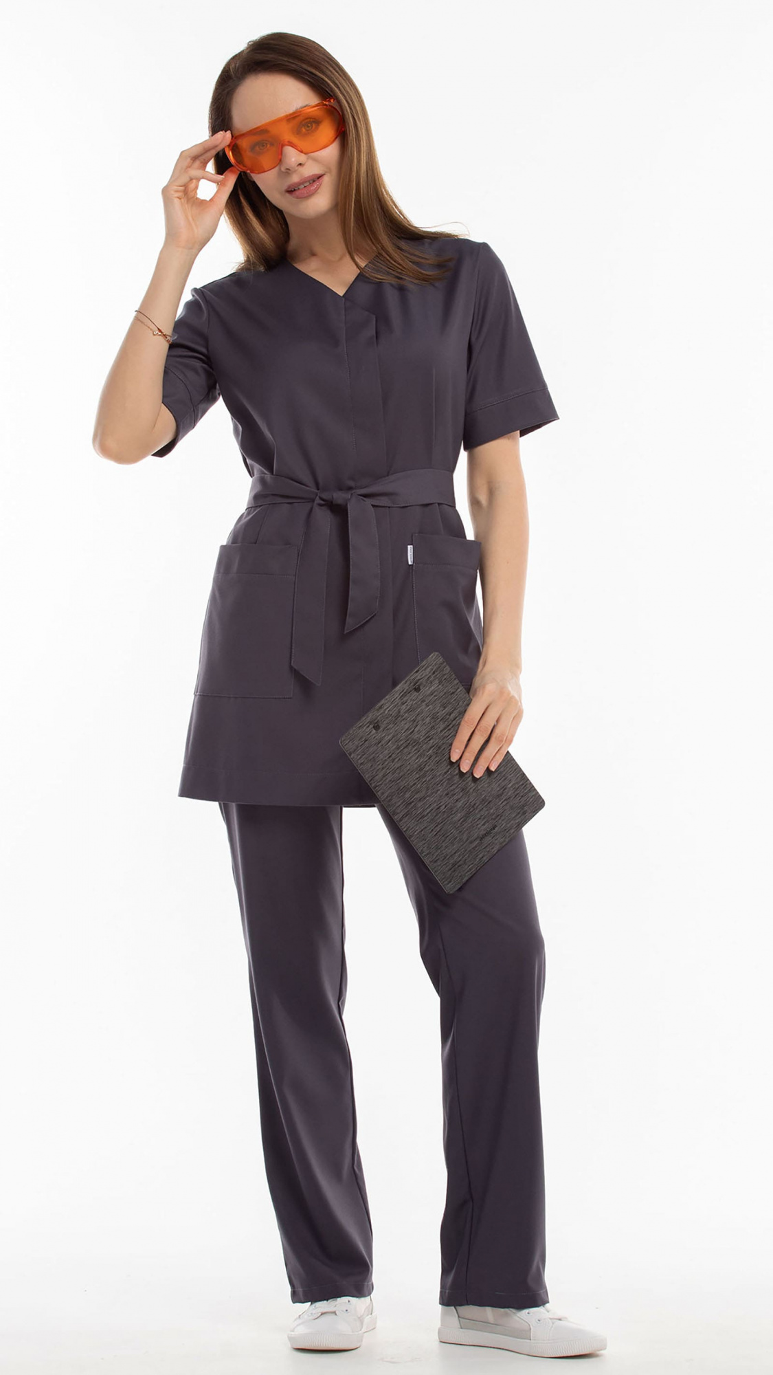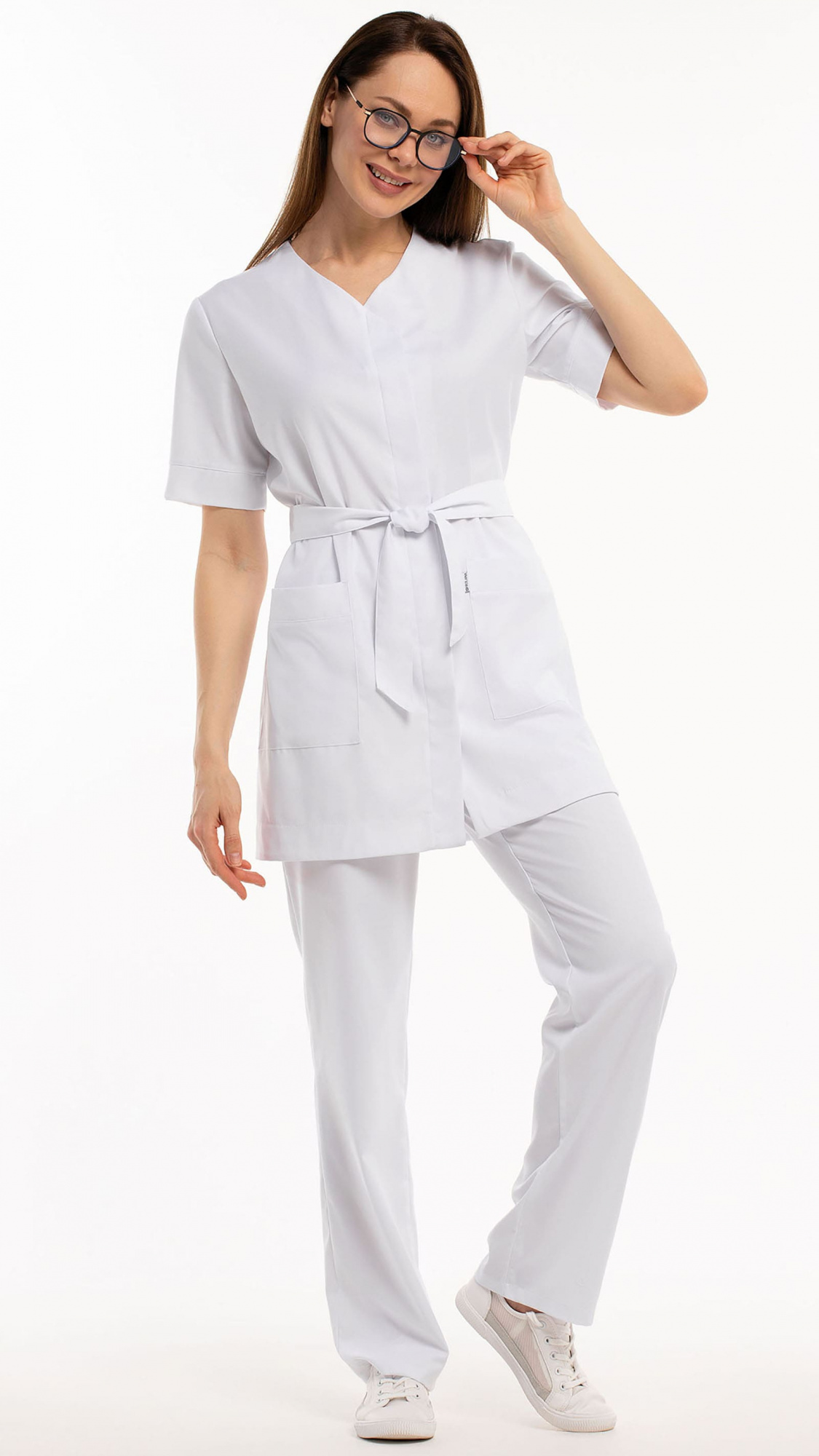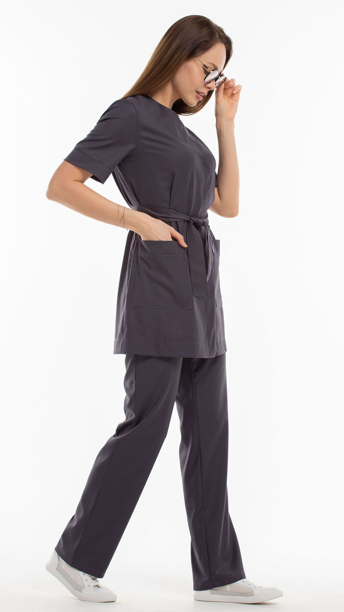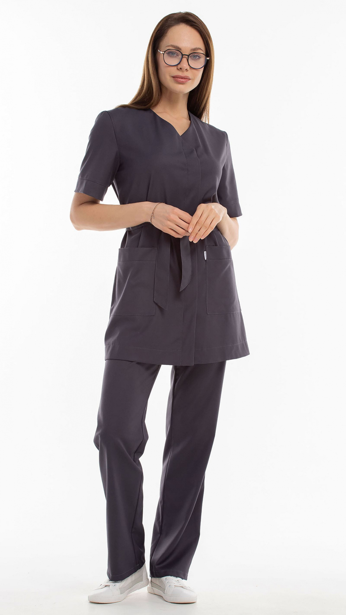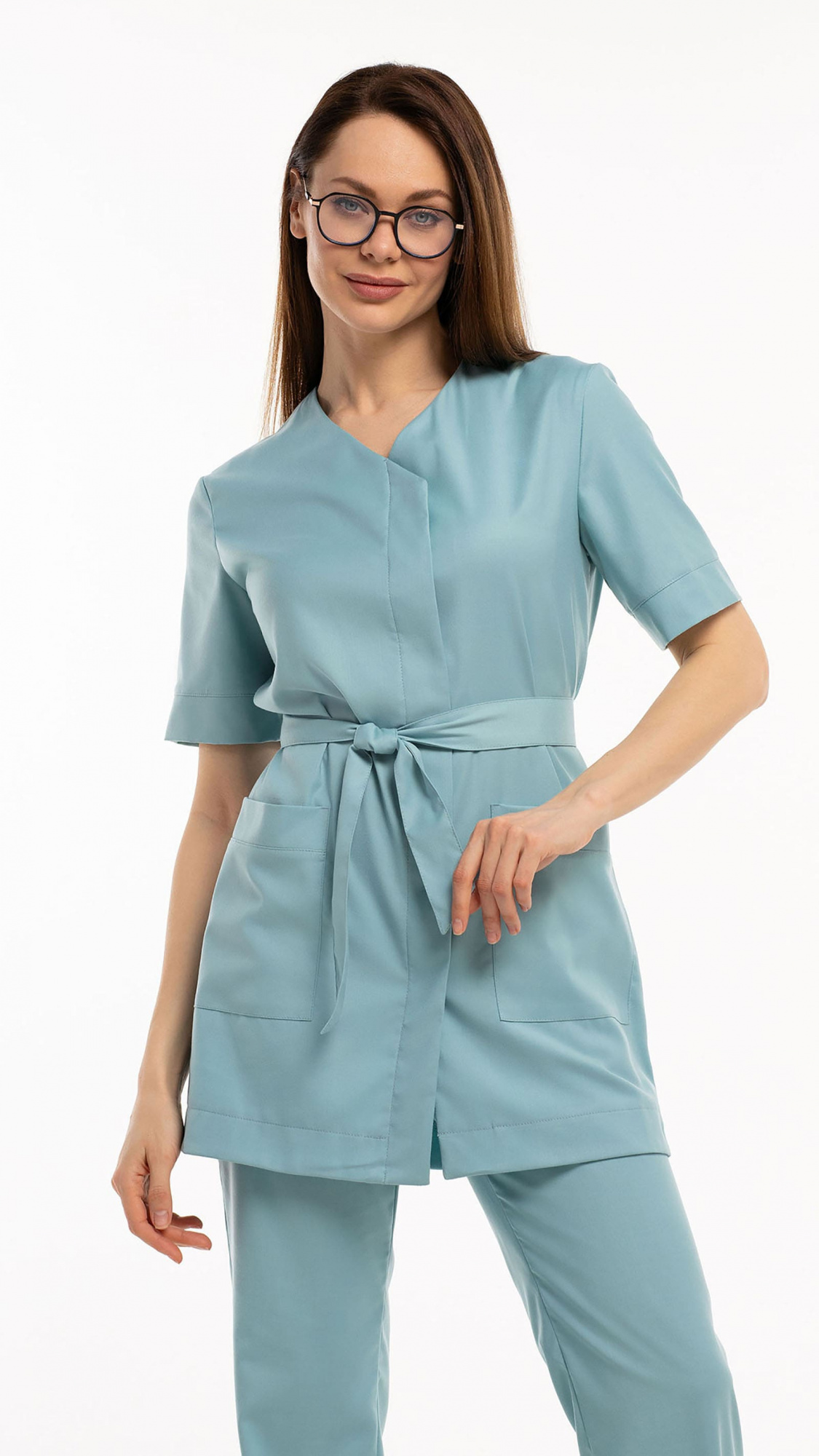 Костюм медицинский женский состоит из удлиненной блузы и брюк.Блуза прямого силуэта со смещенной супатной застежкой на 7 кнопок, с V-образным вырезом горловины, с поясом.