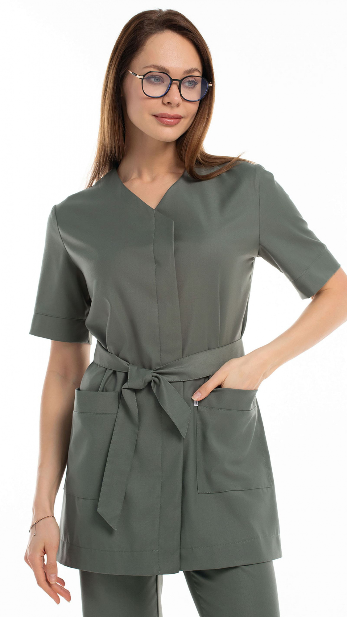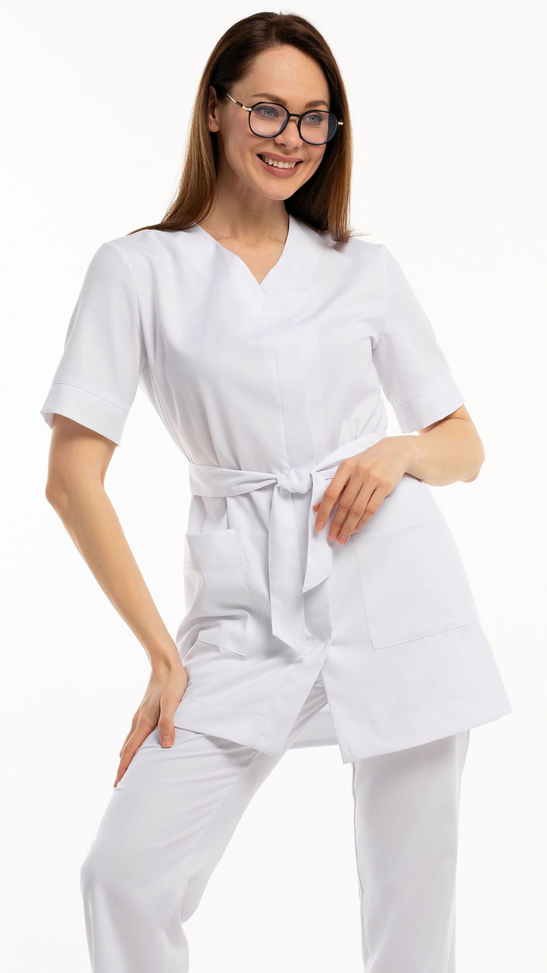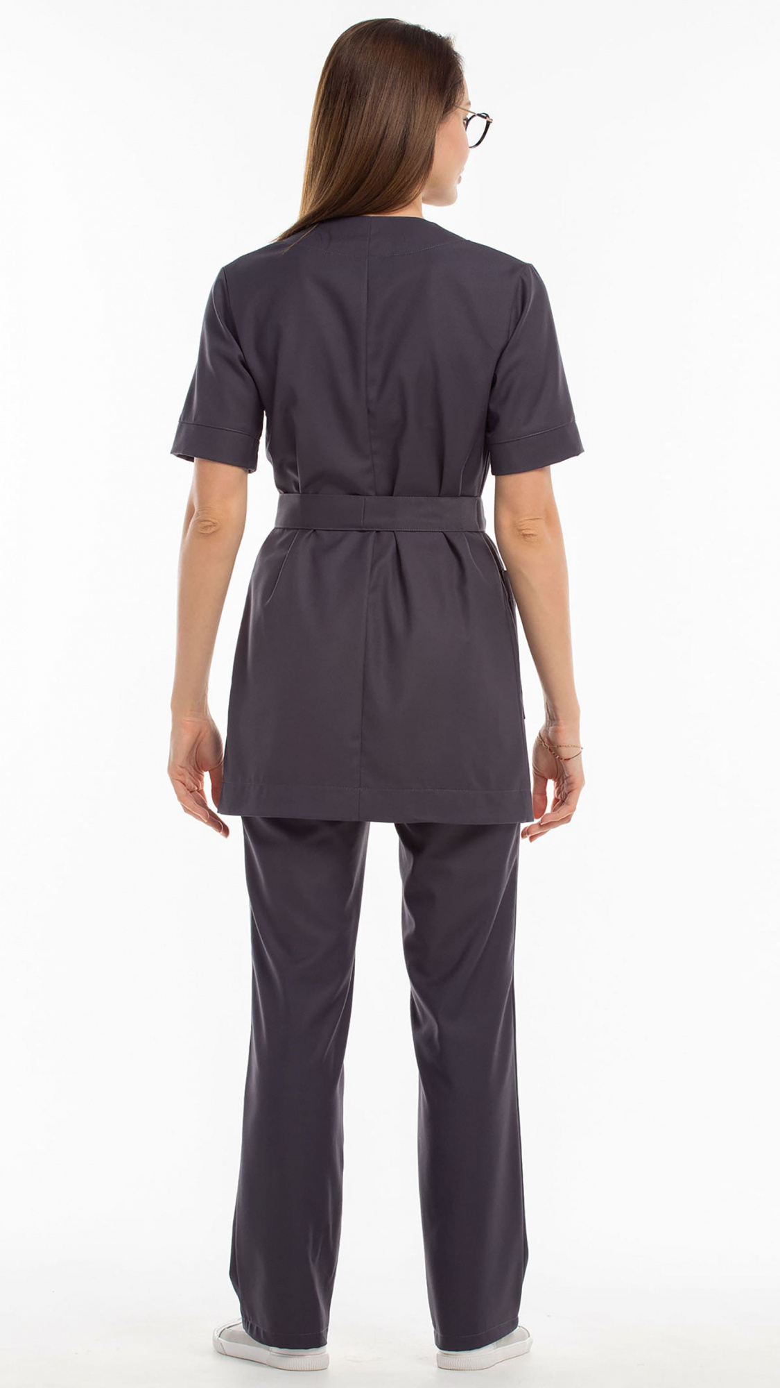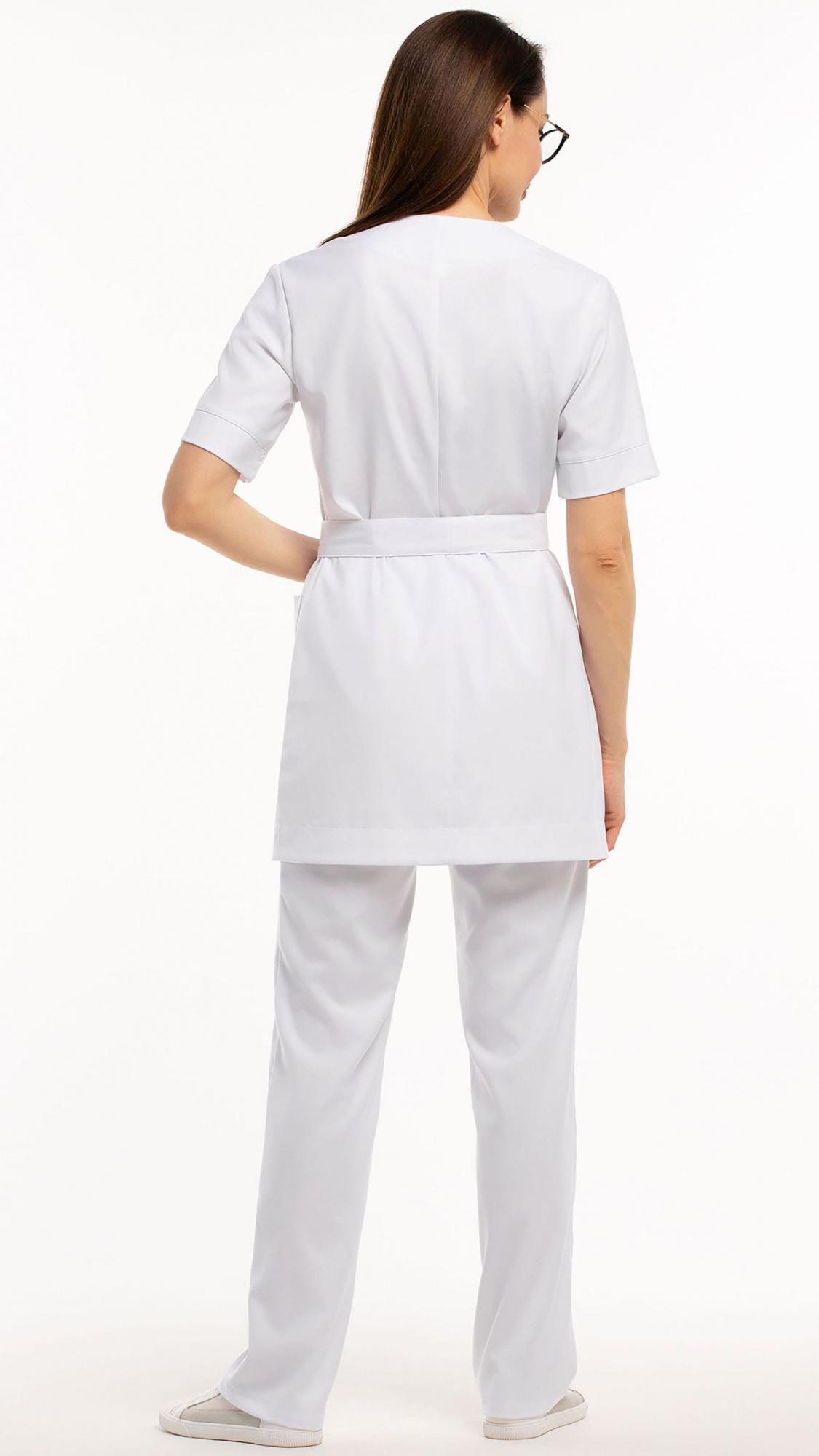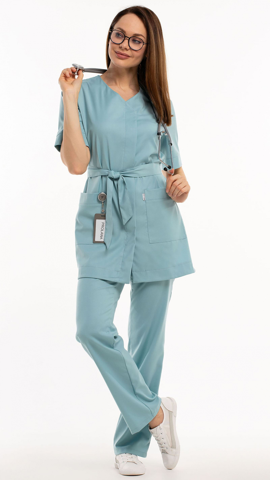 Костюм медицинский женский состоит из удлиненной блузы и брюк.Блуза прямого силуэта со смещенной супатной застежкой на 7 кнопок, с V-образным вырезом горловины, с поясом.