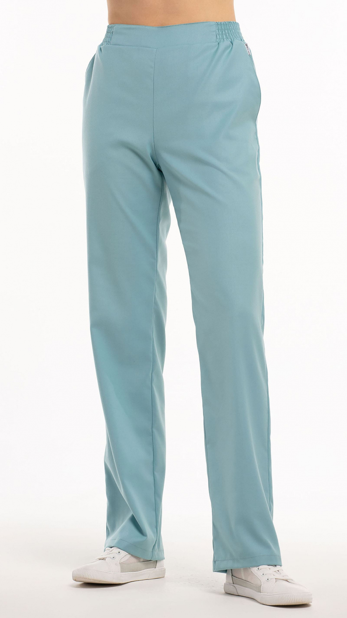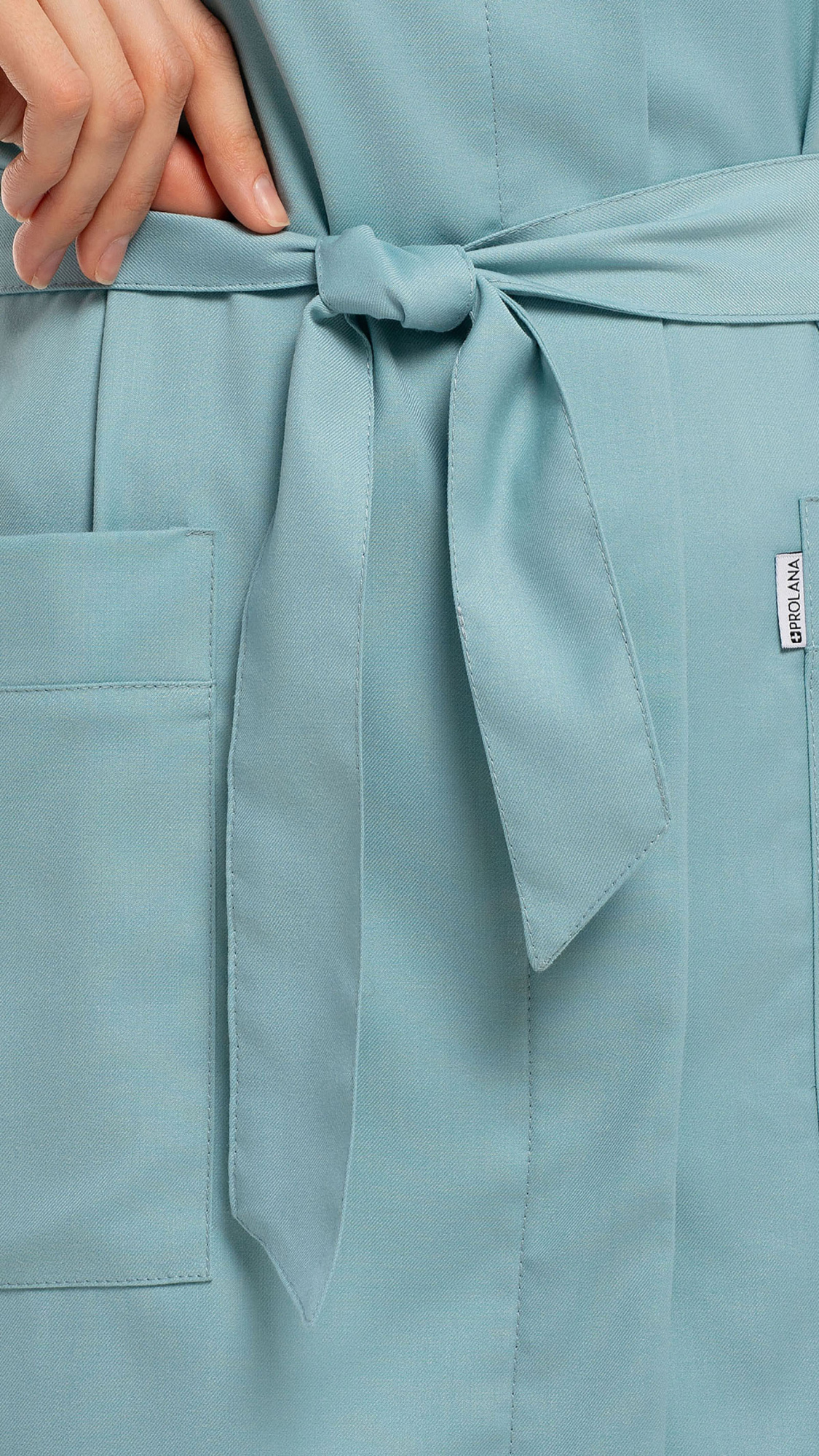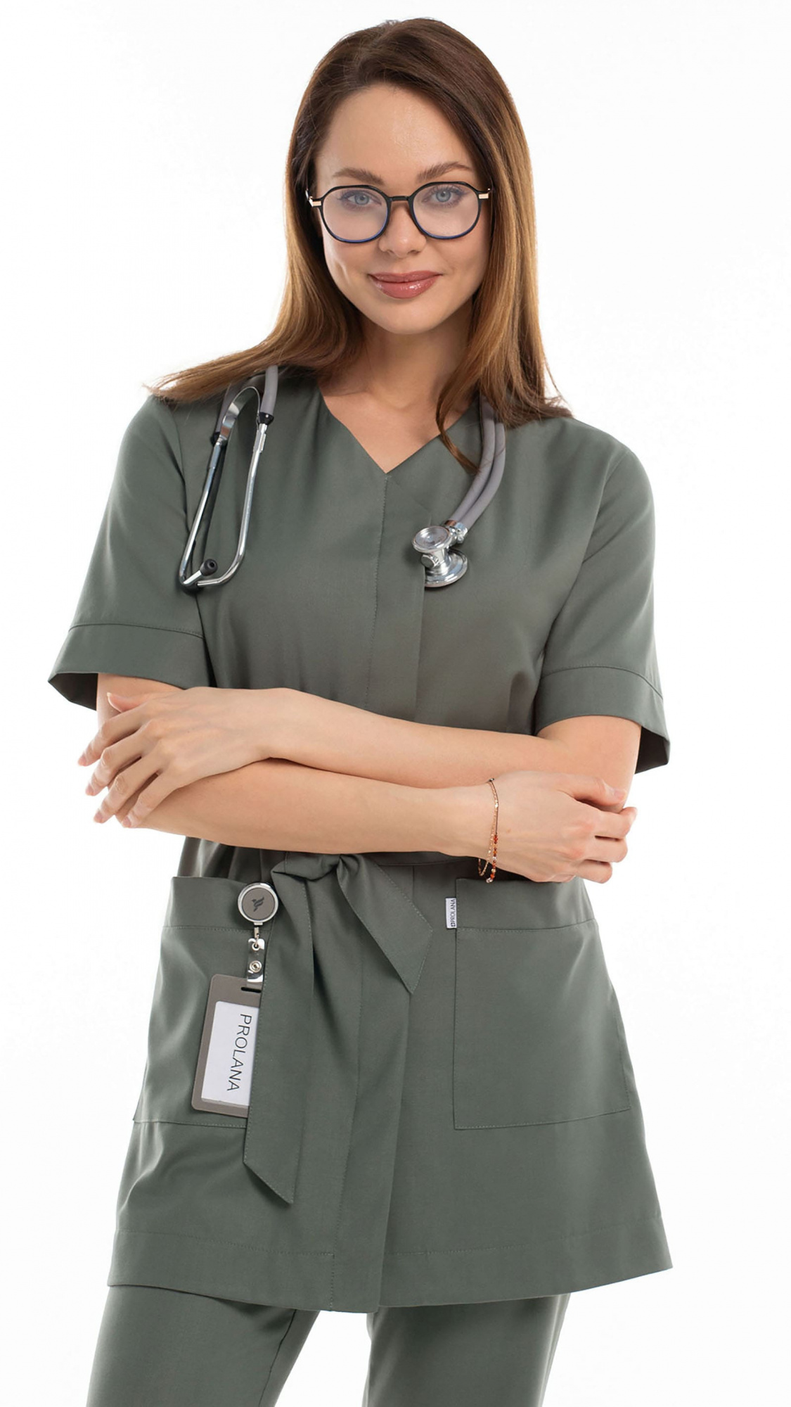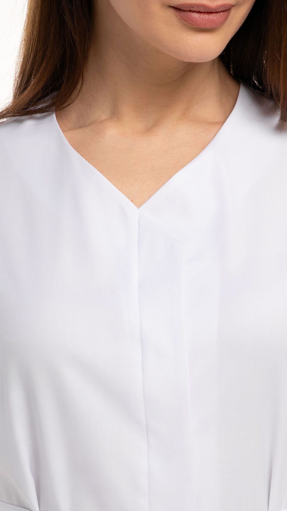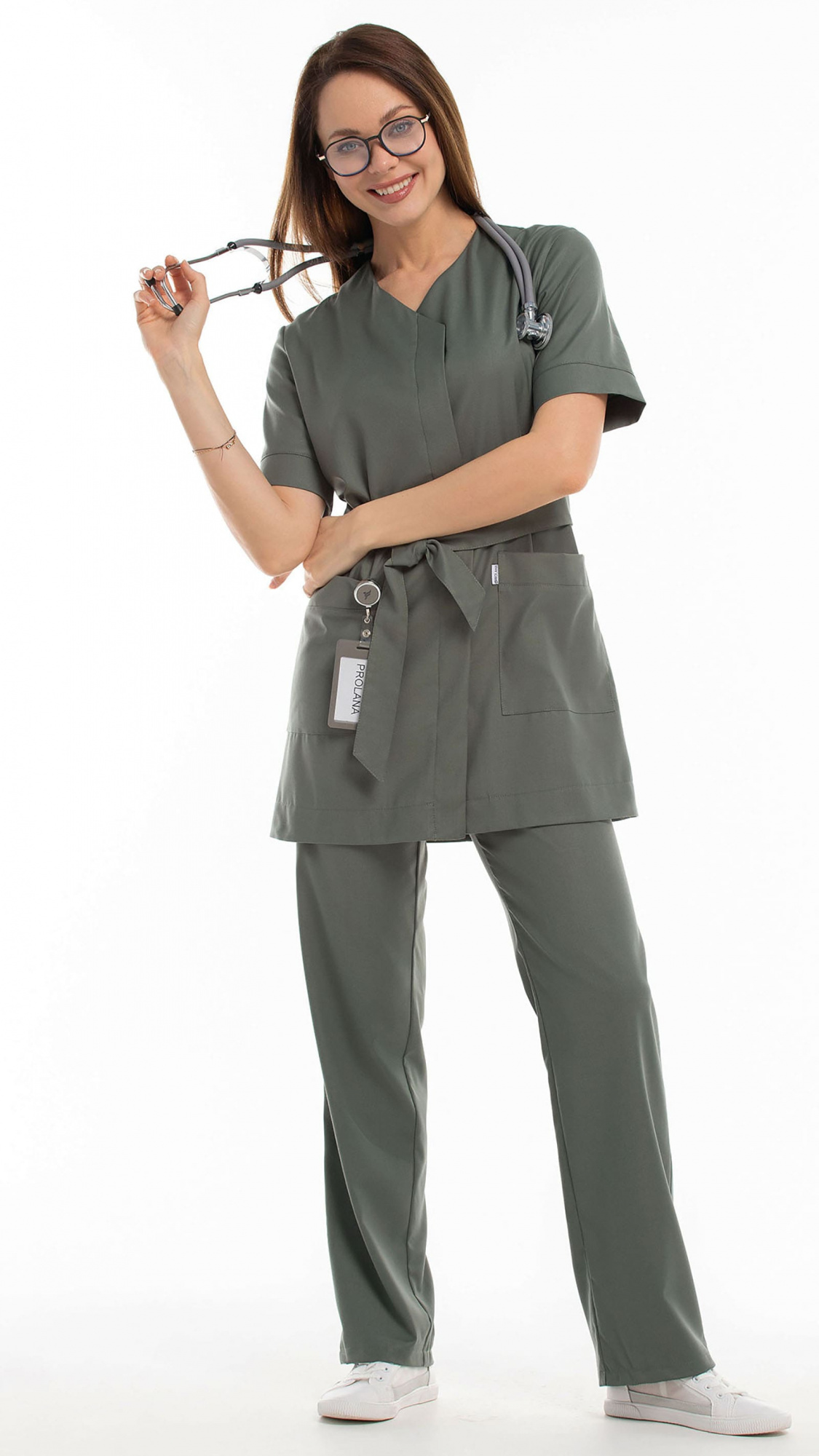Костюм медицинский женский состоит из удлиненной блузы и брюк.Блуза прямого силуэта со смещенной супатной застежкой на 7 кнопок, с V-образным вырезом горловины, с поясом.