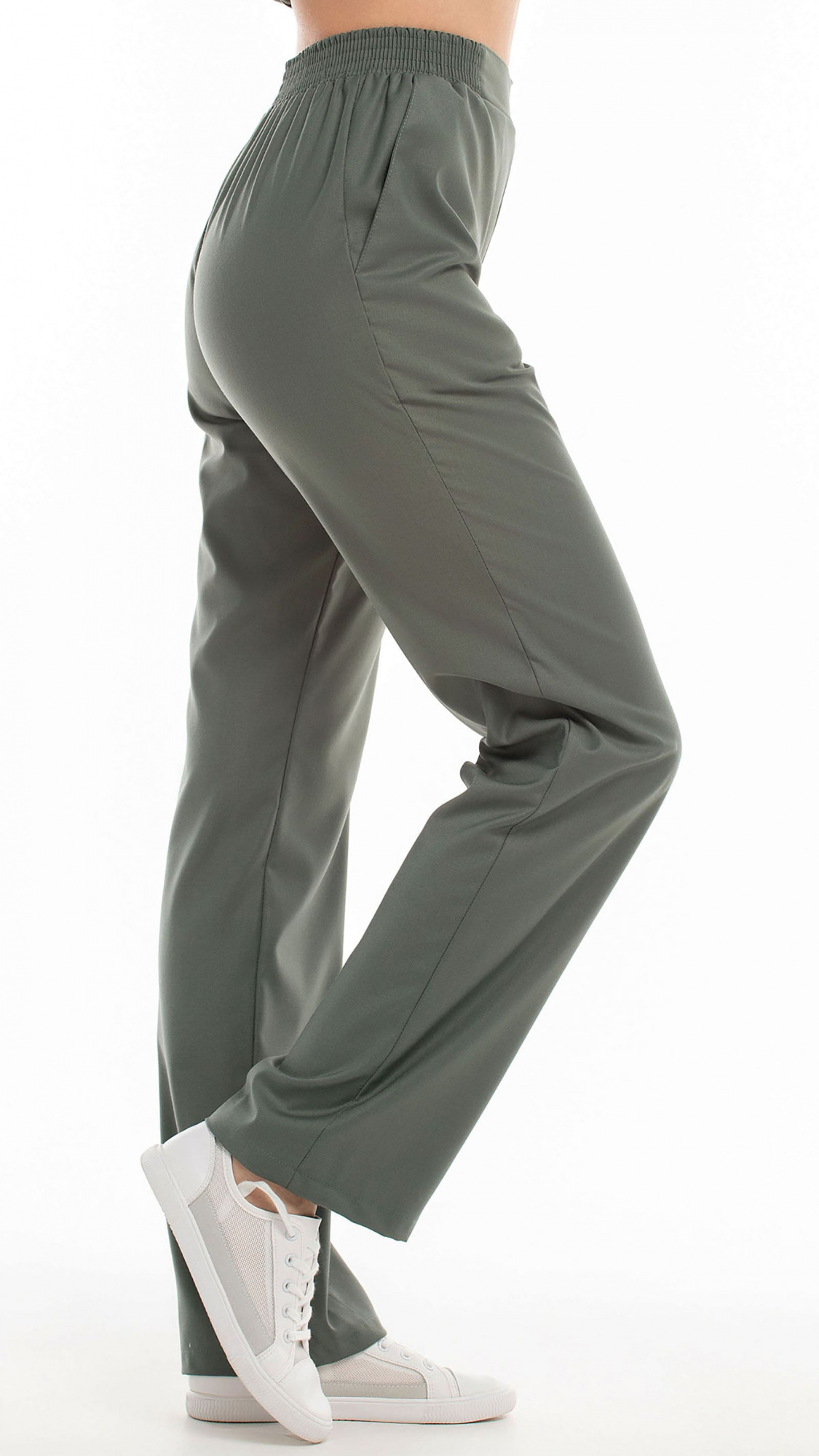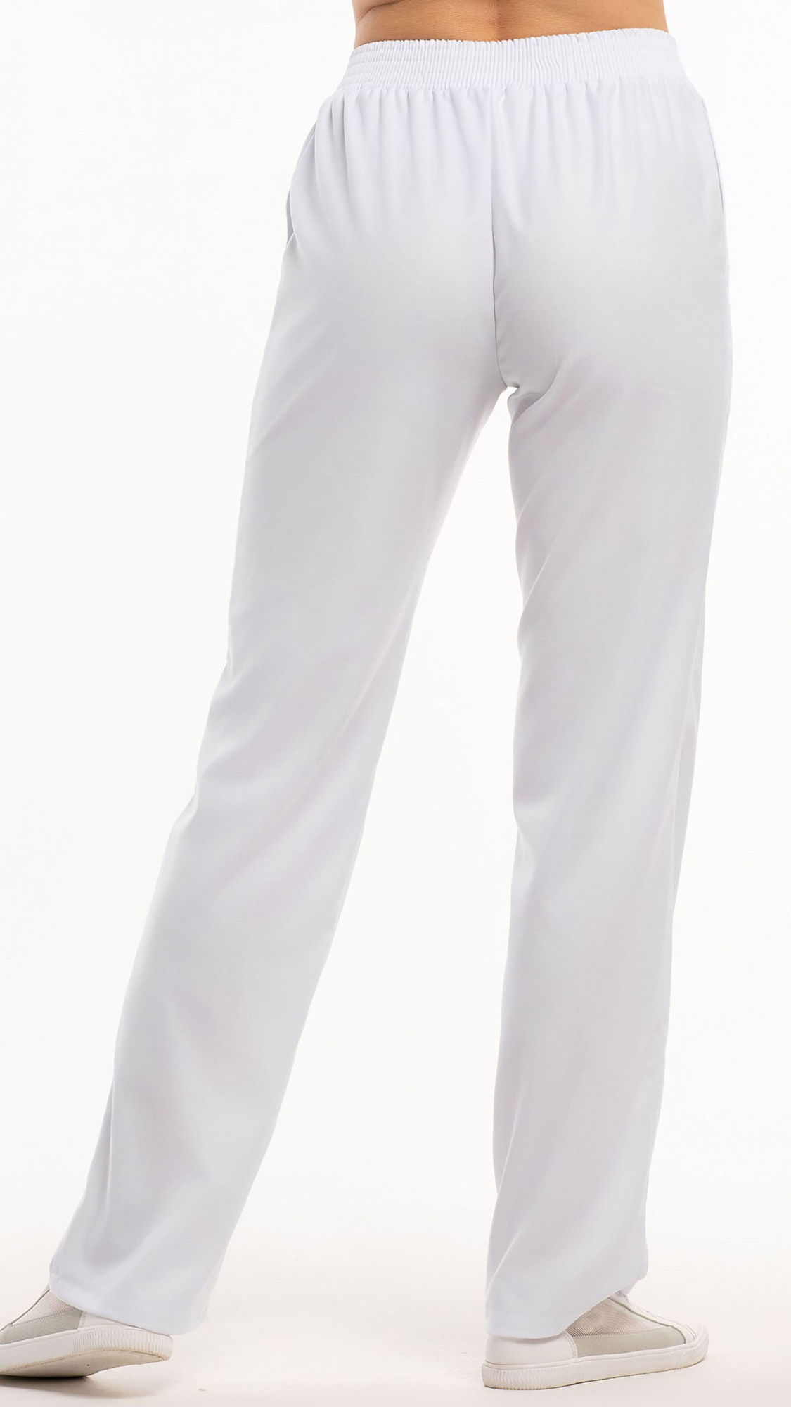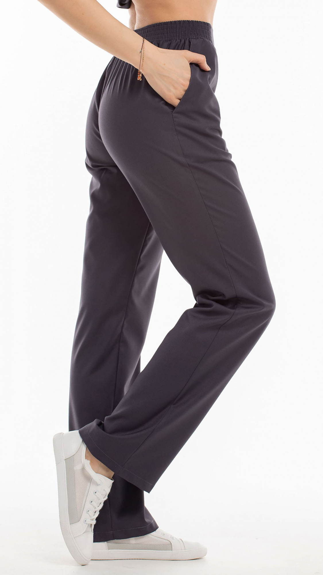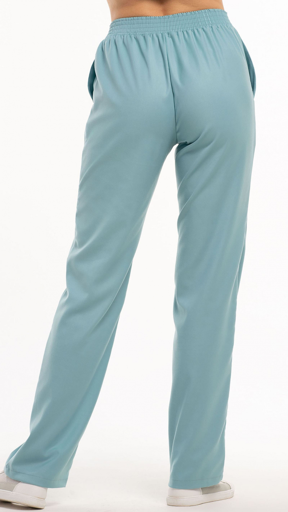 Брюки с притачным поясом, состоящим из двух частей. Центральная часть пояса передних половинок брюк без эластичной тесьмы, вторая часть стянута эластичной тесьмой. Передние половинки брюк с боковыми карманами в отрезных бочках со скруглёнными входами. Низ брюк обработан швом вподгибку с закрытым срезом.