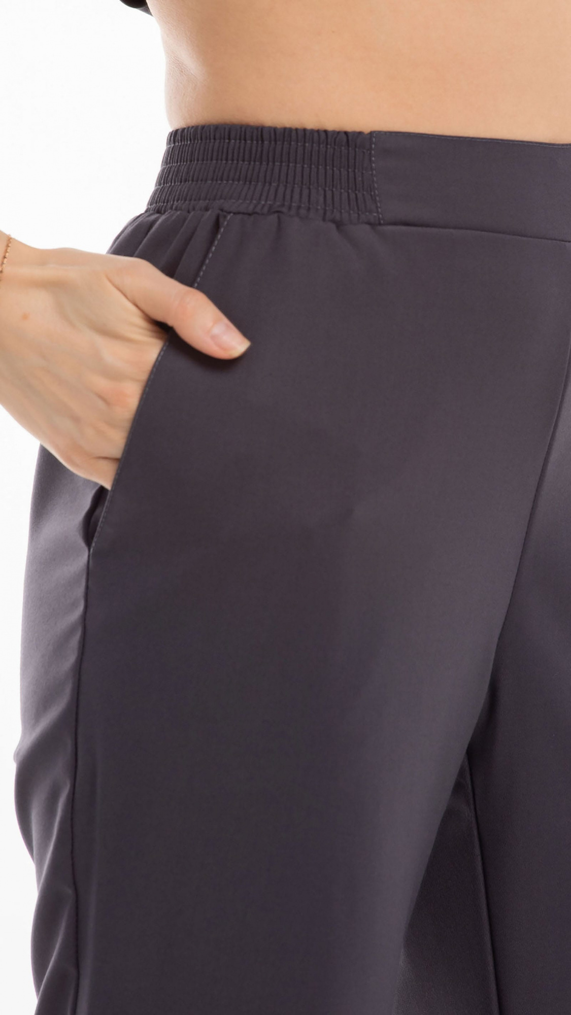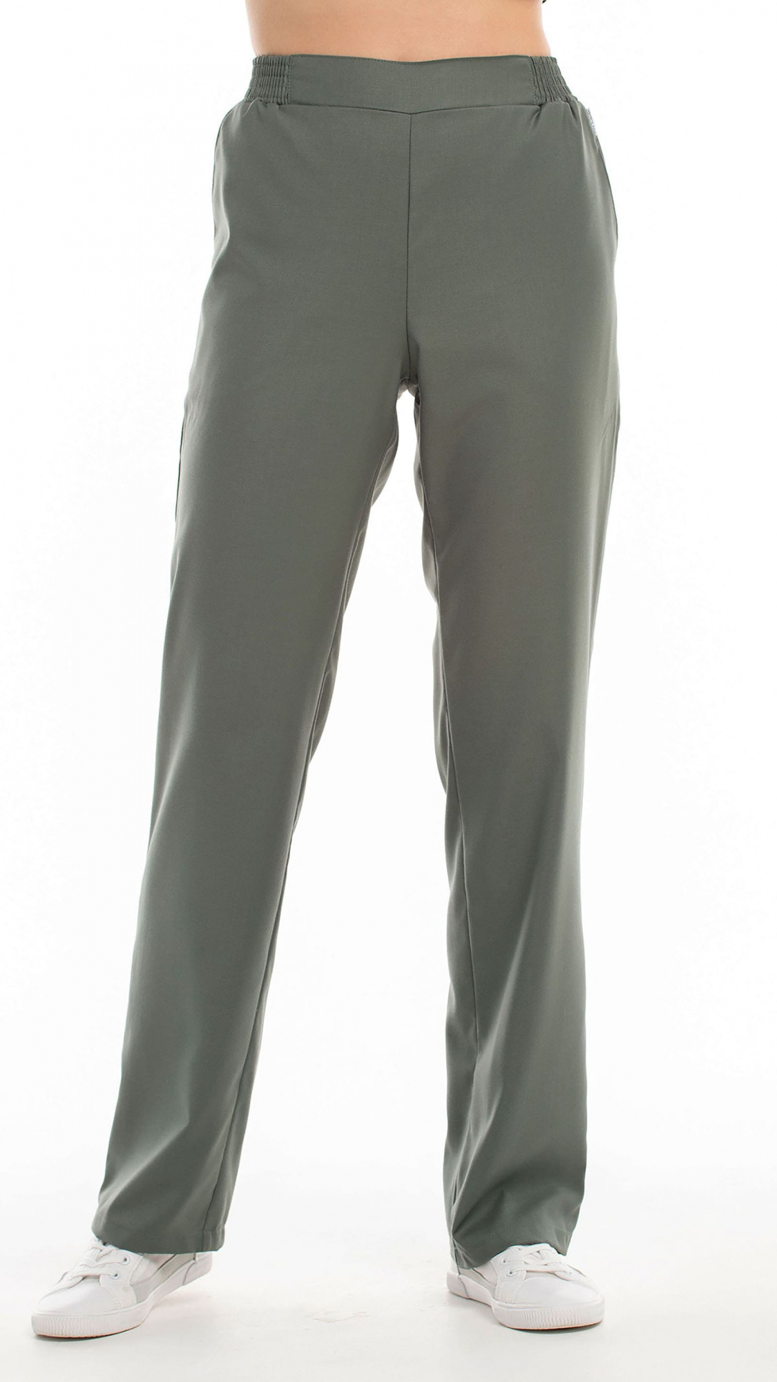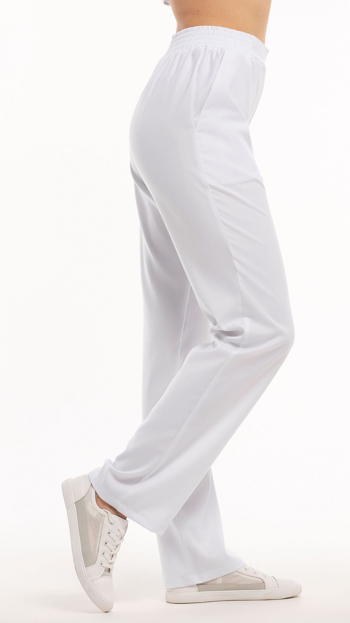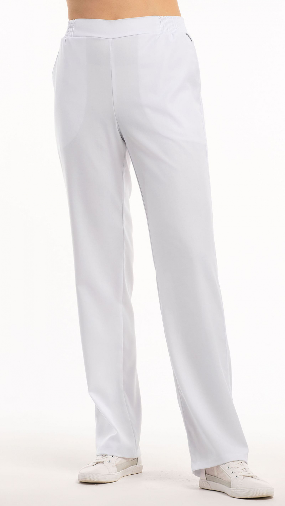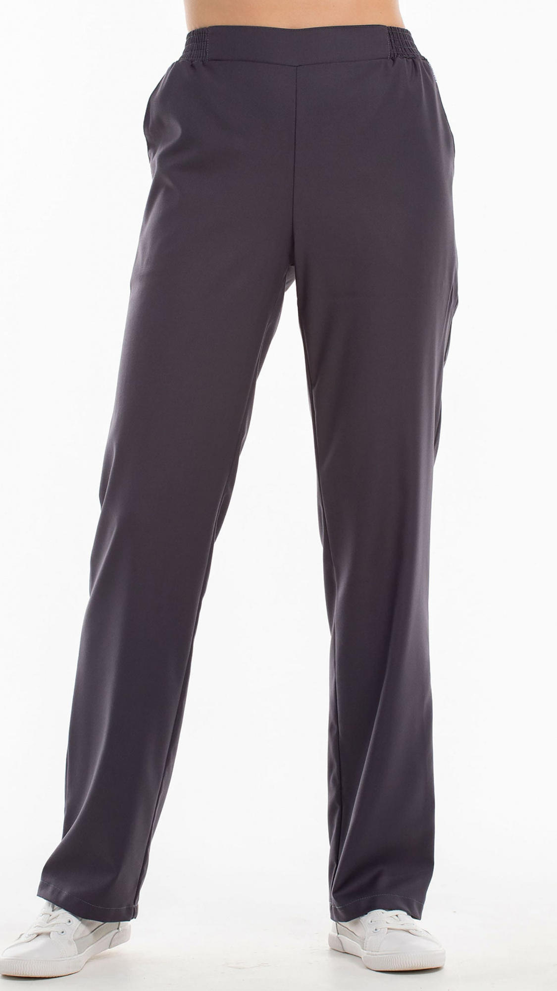 Брюки с притачным поясом, состоящим из двух частей. Центральная часть пояса передних половинок брюк без эластичной тесьмы, вторая часть стянута эластичной тесьмой. Передние половинки брюк с боковыми карманами в отрезных бочках со скруглёнными входами. Низ брюк обработан швом вподгибку с закрытым срезом.