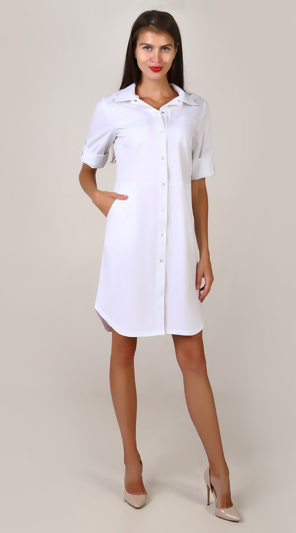 Халат медицинский женский полуприлегающего силуэта с центральной бортовой застежкой на 8 кнопок.Полочки отрезные по линии талии. Верхние части полочек с нагрудными вытачками и накладными нагрудными компаниями. На нижних частях полочек внутренние боковые карманы с отрезным бочком. Края бортов обработаны притачными планками.