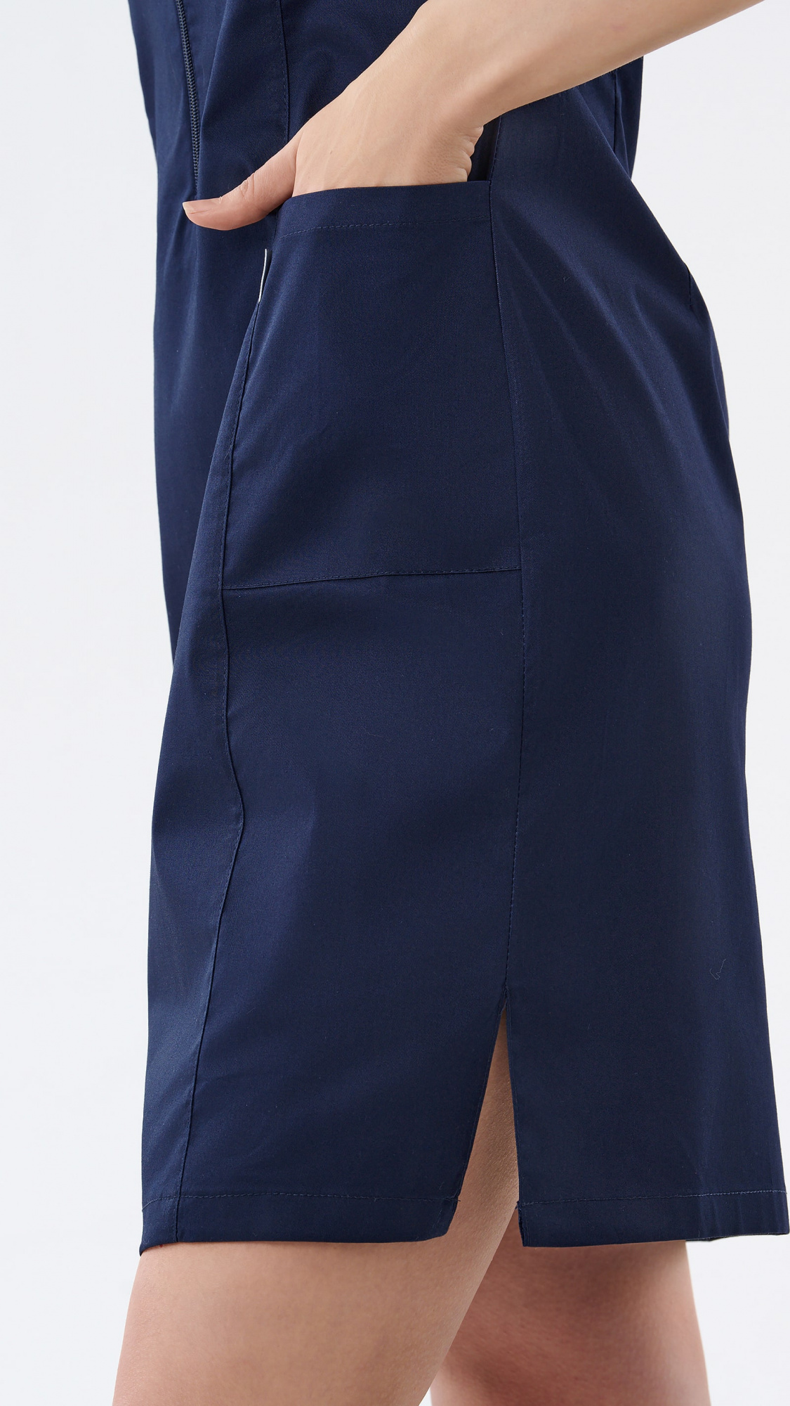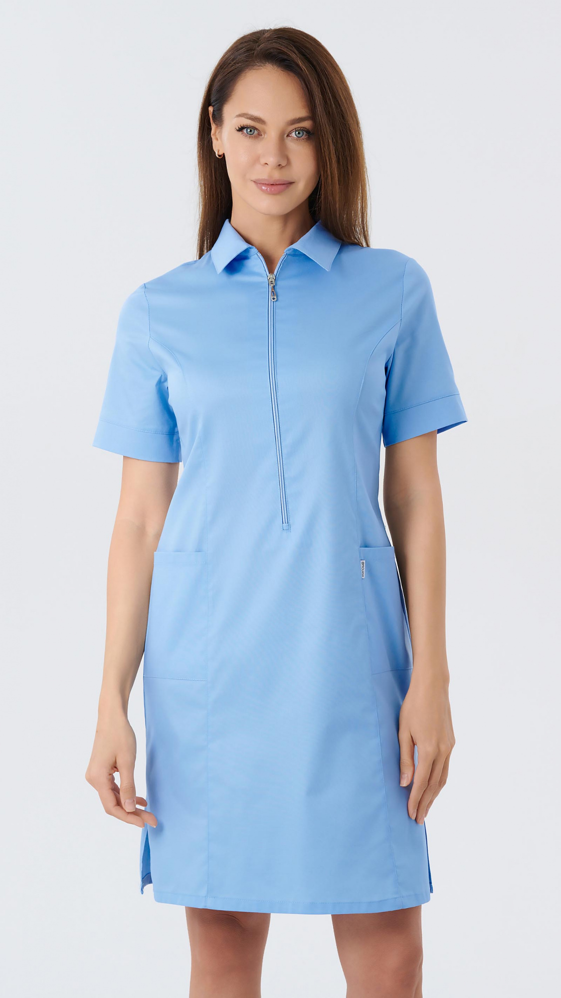 Платье женское полуприлегающего силуэта с центральной застежкой на тесьму-молнию до линии талии с боковыми разрезами.Полочка с рельефами, выходящими из проймы до низа изделия. На боковых частях полочек нижние накладные боковые карманы.